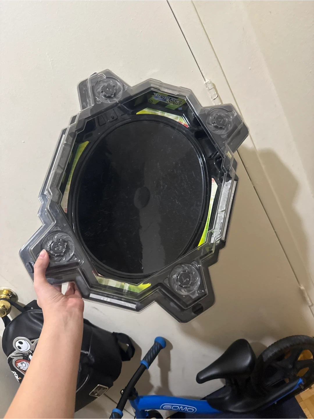 This is a Beyblade Burst arena for exciting battles. It's made of durable plastic and features a black playing surface. Great for aspiring Beyblade champions!