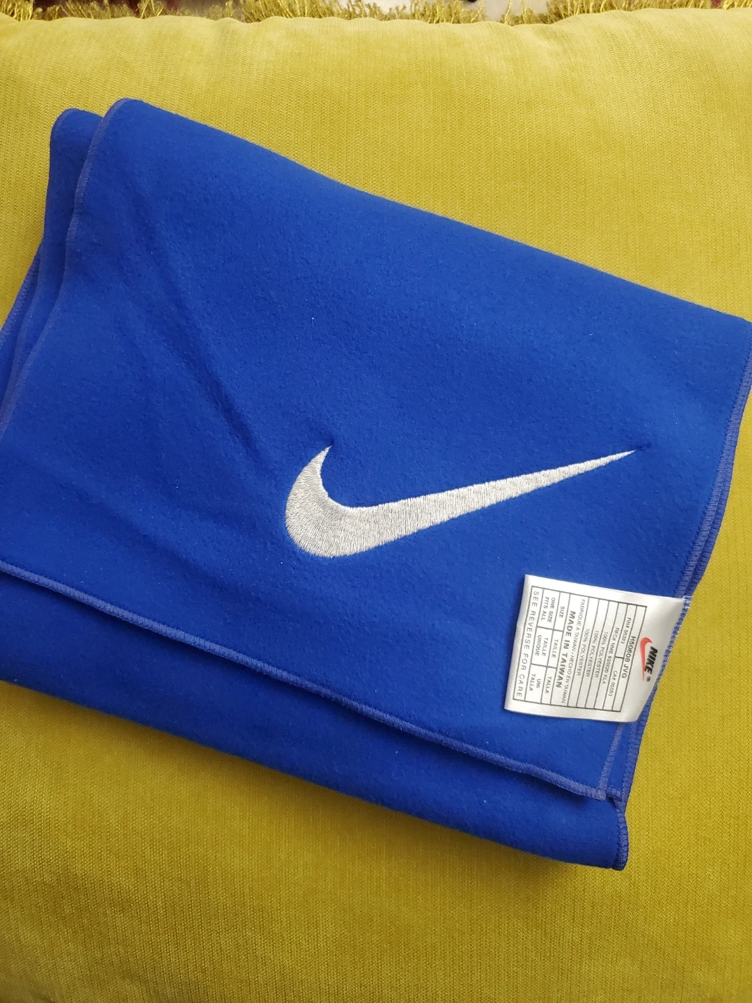 This is a blue Nike fleece scarf. It's made of 100% polyester. This blanket is one size fits all and was made in Taiwan. It's perfect for staying warm!
