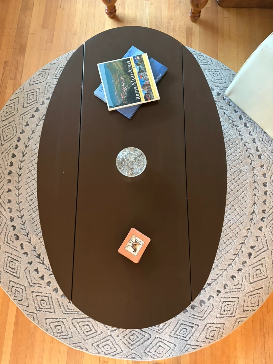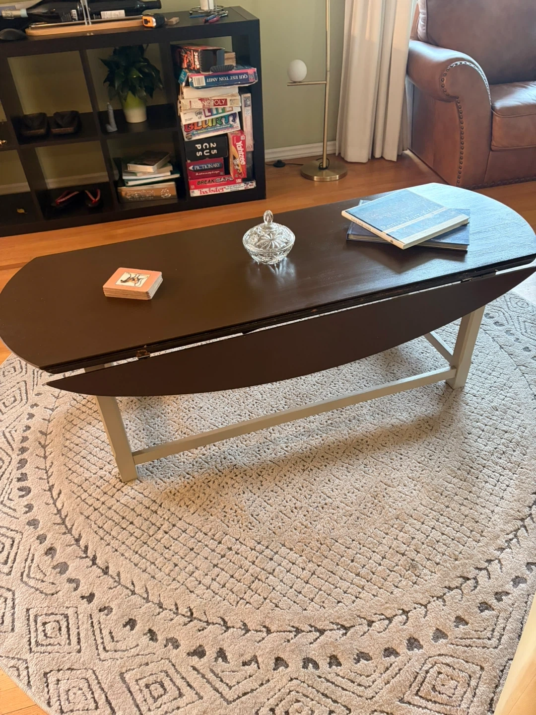 This oval coffee table has a dark brown tabletop with drop leaves. It features a painted light grey base. The table is great for smaller spaces or for when you need extra surface area.