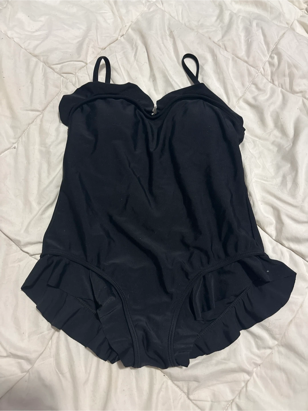 A classic black one-piece swimsuits with a ruffled hem. It features adjustable straps for a comfortable fit.