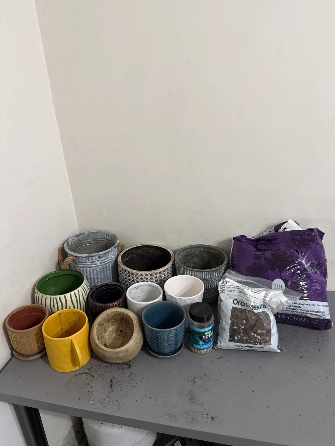11 medium and small plant pots. ($5 small, $10 medium each) $50 for all.