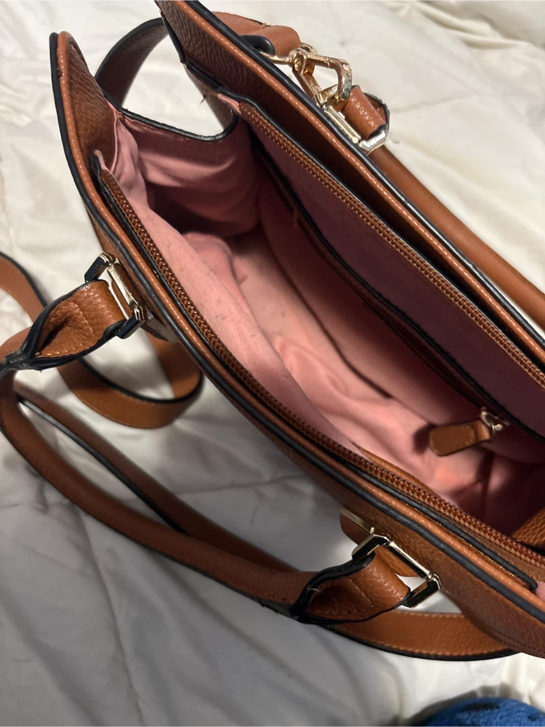 This brown satchel handbag is made of faux leather with a textured finish. It features a zip-top closure and a pink fabric lining inside. An adjustable, detachable shoulder strap is included.