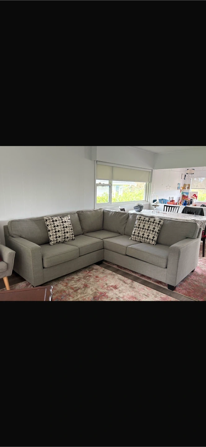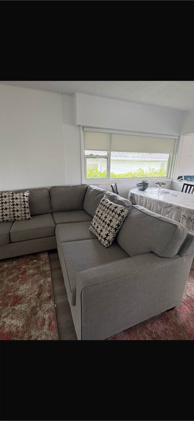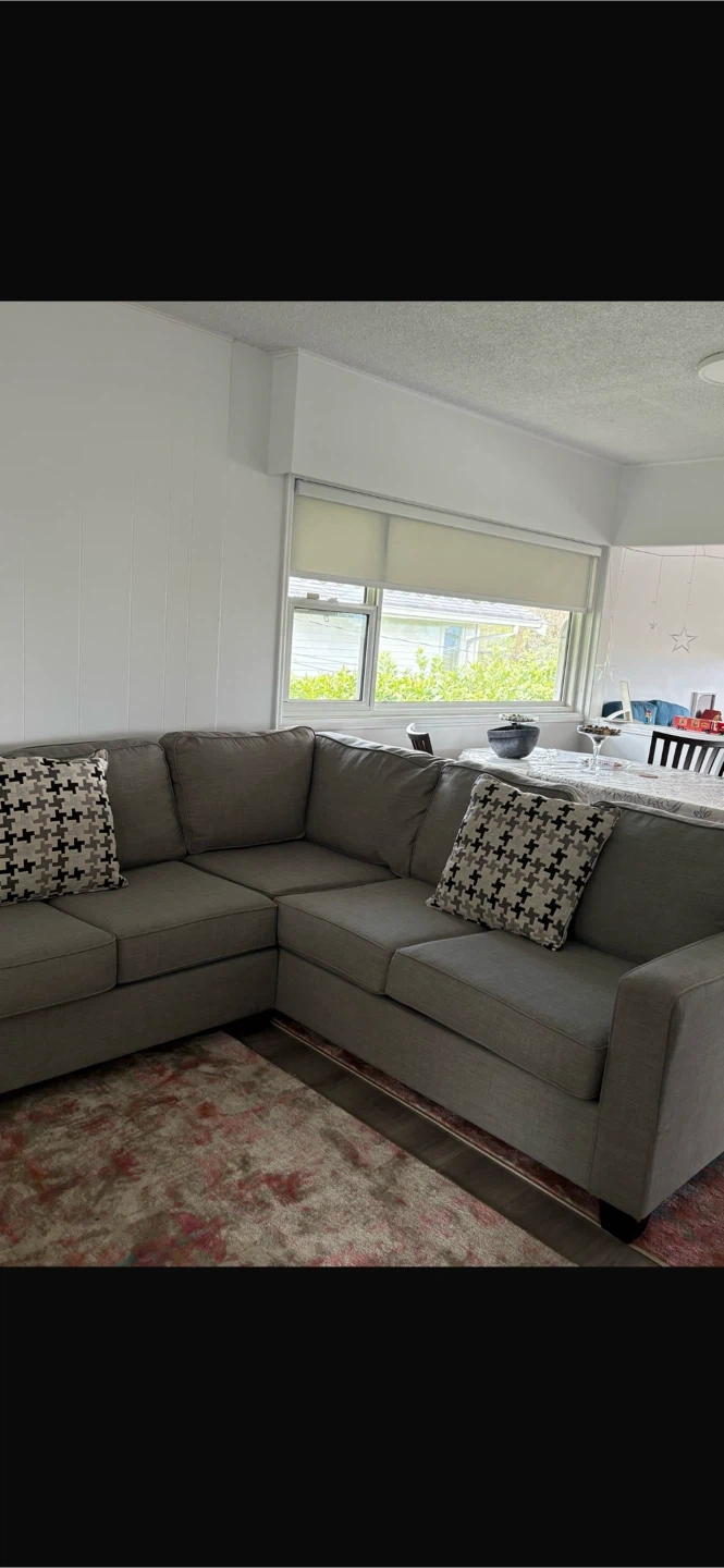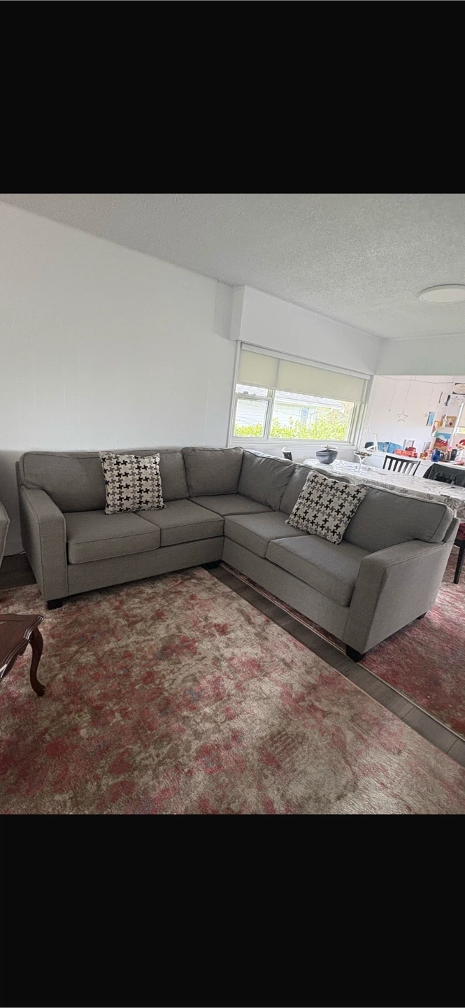 A comfortable grey sectional sofa, perfect for a living room. Upholstered in a durable fabric with clean lines. Includes two decorative throw pillows.