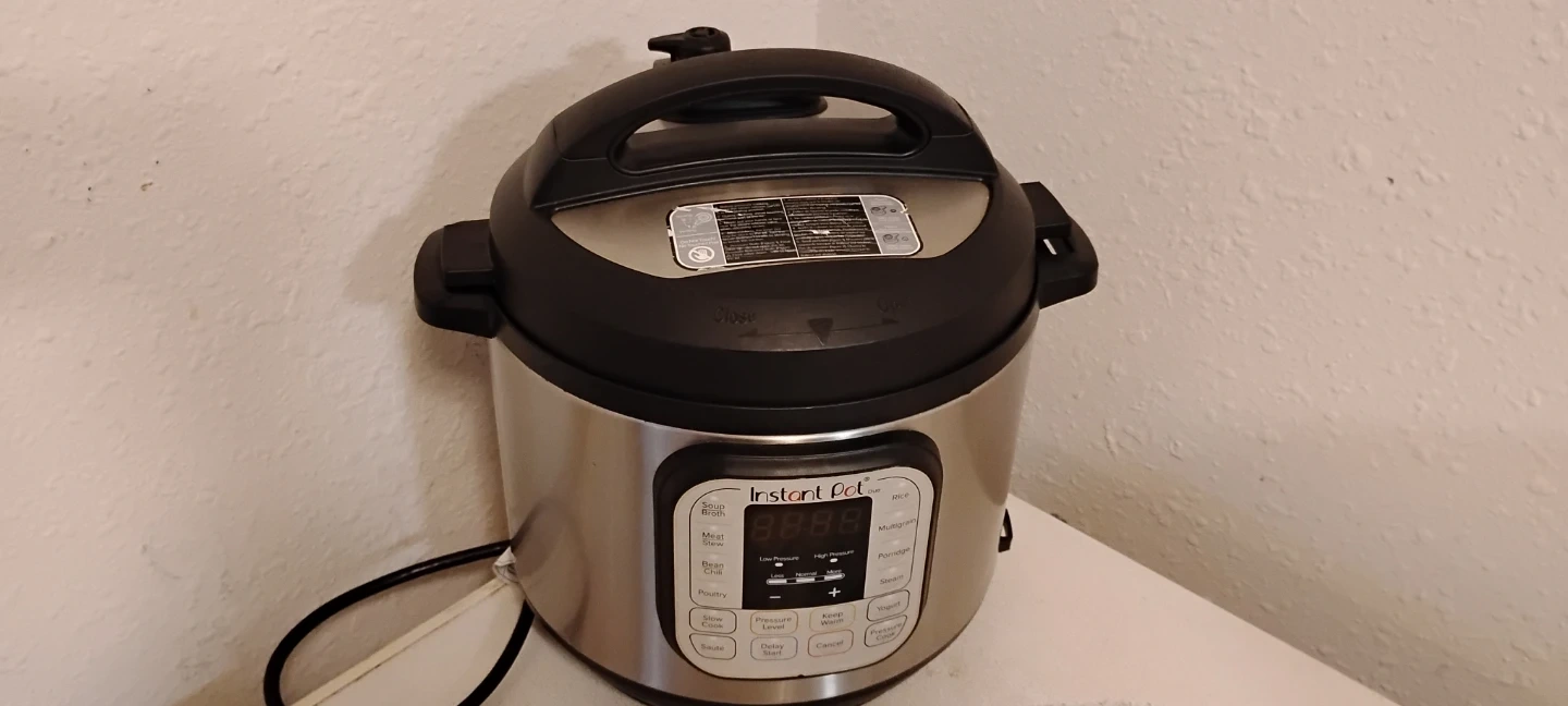 This Instant Pot Duo is a versatile 7-in-1 electric pressure cooker. It functions as a pressure cooker, slow cooker, rice cooker, steamer, sauté pan, yogurt maker, and warmer. It's great for preparing a variety of meals quickly and efficiently. Includes a stainless steel inner pot and a stainless steel steam rack.
