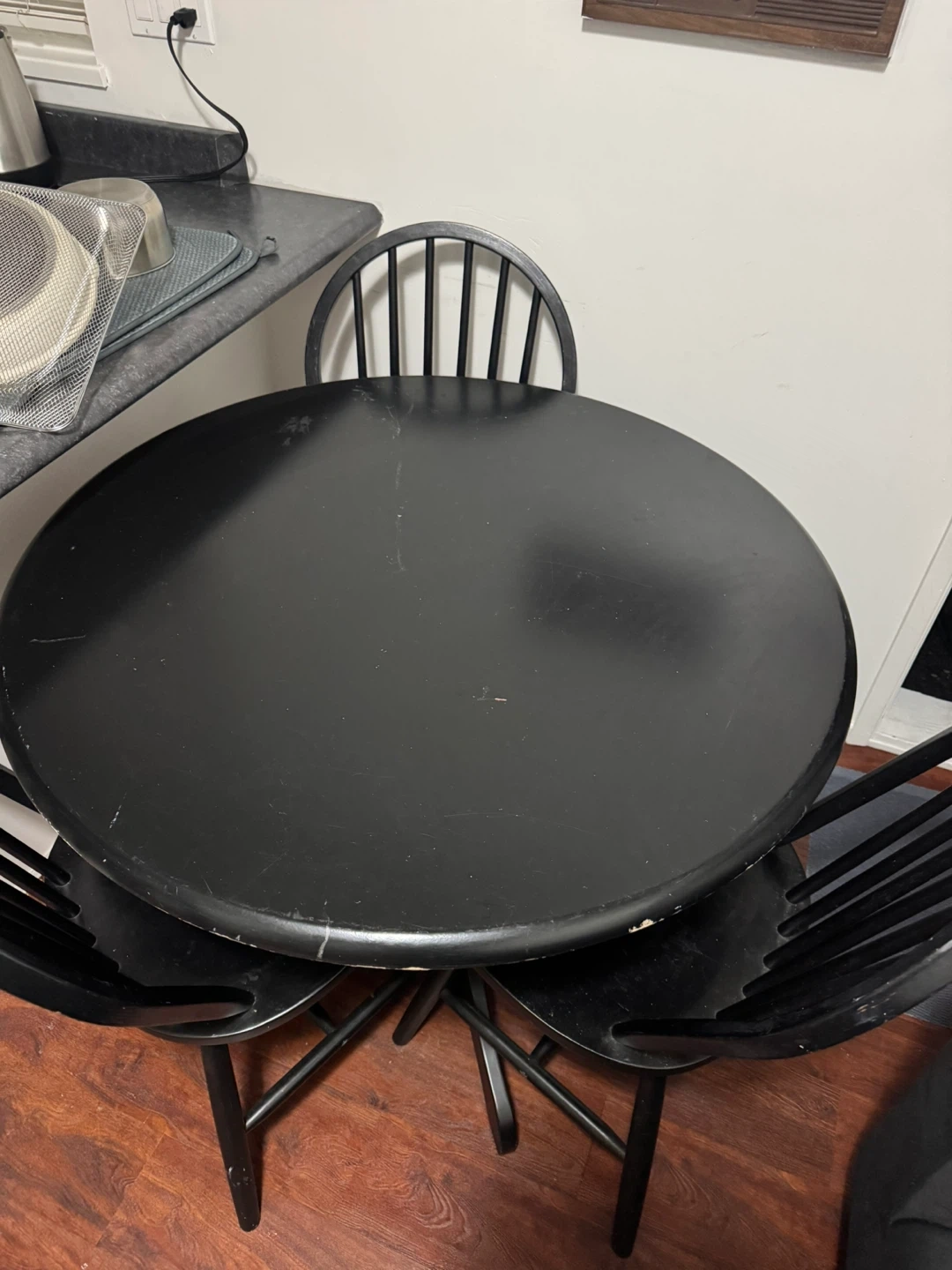 This is a black, round dining table with three matching spindle-back chairs. The table is made of wood and features a matte black finish. Its compact size makes it suitable for smaller dining areas or kitchens.
