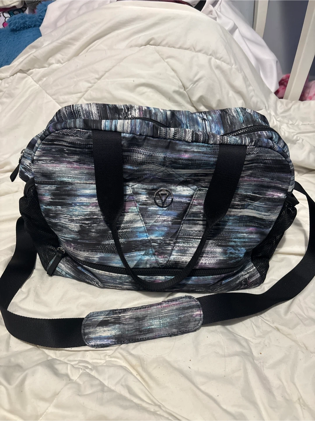 This Lululemon duffle bag has a vibrant, abstract pattern. It features multiple interior pockets and a bottom hidden pocket for shoes or slippers. Made with durable fabric. Perfect for any kid of sports with lots of space.