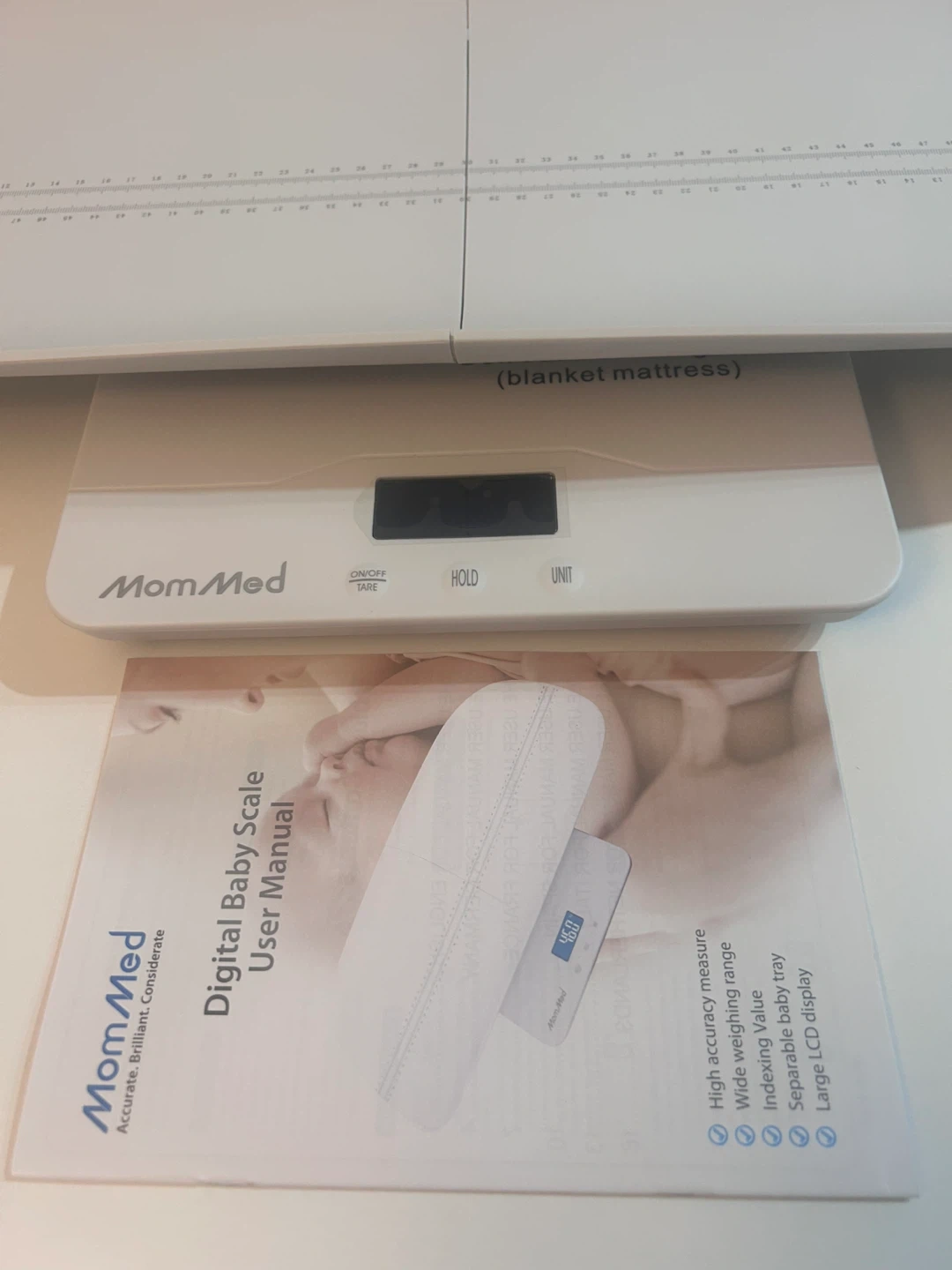 MomMed digital baby scale for accurate measurements. It has a wide weighing range and a large LCD display. Includes the user manual.