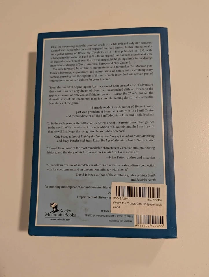 For sale is a beautiful copy of the mountaineering classic "Where the Clouds Can Go" by legendary guide Conrad Kain. This is the sought-after 2009 Rocky Mountain Books expanded reissue, featuring over 50 archival images and a new foreword by acclaimed mountaineer Pat Morrow. If you are a hiker, climber, or a fan of Canadian Rockies history, this is a must-have for your library. Condition: Very Good - Excellent. Spine is tight and uncreased. Pages are crisp, clean, and free of writing/highlighting. Minor shelf wear to the cover edges (see photos). About the Book: Conrad Kain was the first official guide of the Alpine Club of Canada and notched over 60 first ascents. This autobiography is widely considered one of the greatest pieces of mountain literature ever written. Pick-up: Burlington (near Appleby/Dundas). Cash or e-transfer accepted.
