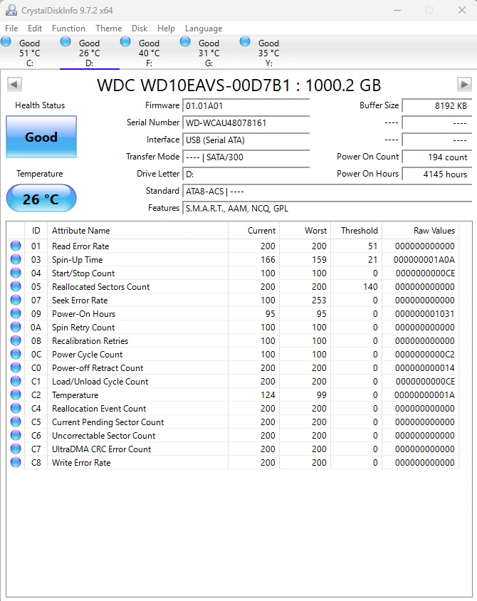 Please see CrystalDiskInfo screenshot in the other photo for the health status of the drive.