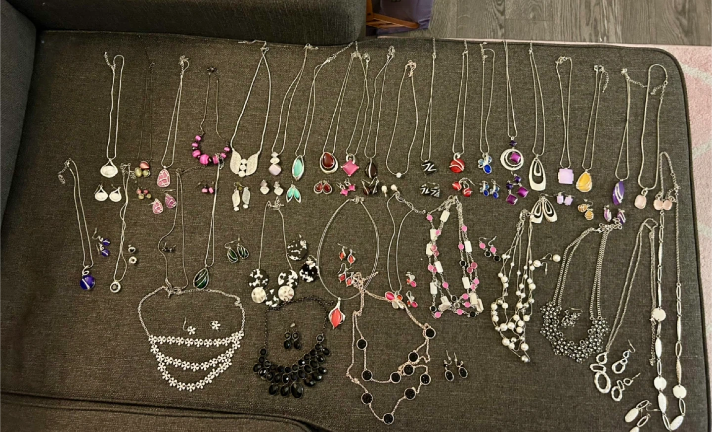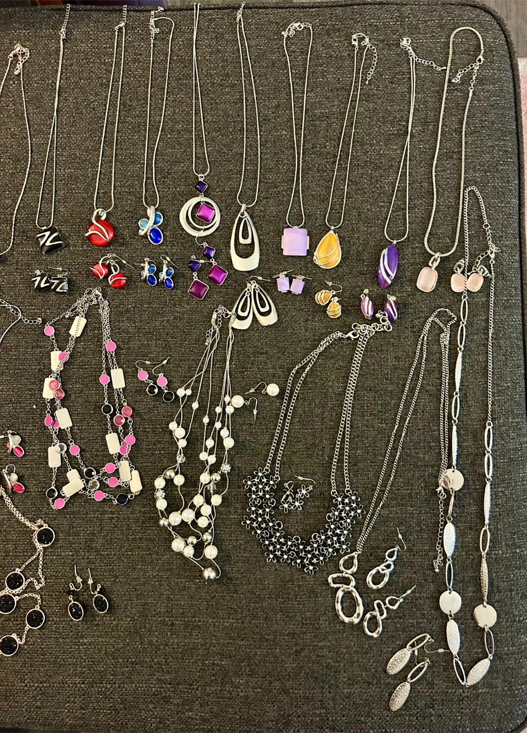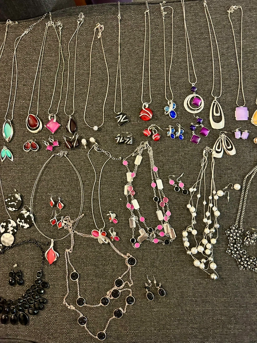 The lot includes statement necklaces, delicate chains, and matching earring sets.