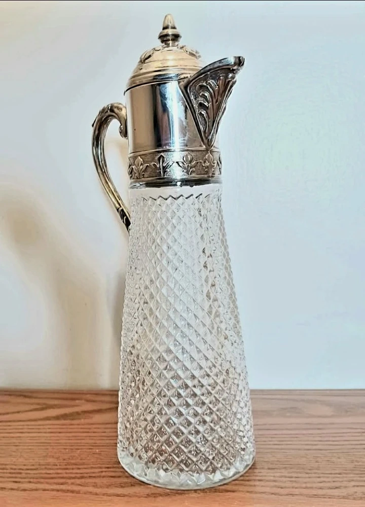 Vintage Italian Silver Plated Pitcher features a Stunning Diamond Hand cut Crystal body and an ornate silver plated top and handle.