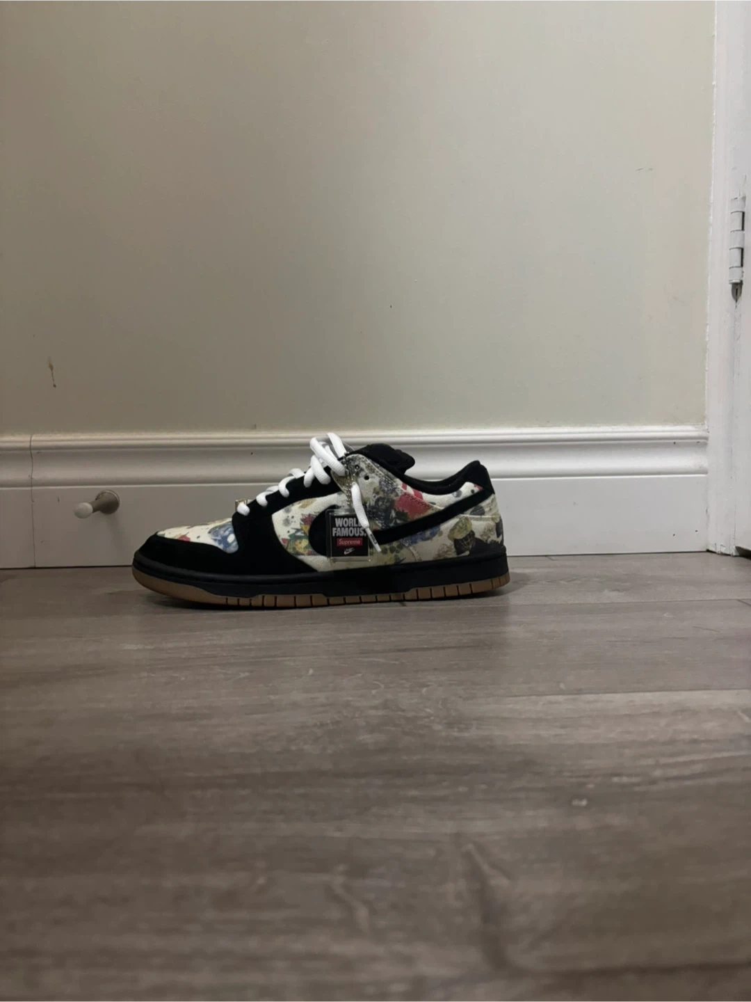 These Nike SB Dunk Lows feature a bold, artistic design with a mix of black suede and a colourful, abstract pattern. They have a durable gum rubber outsole and come with white laces. Perfect for collectors and skaters alike!