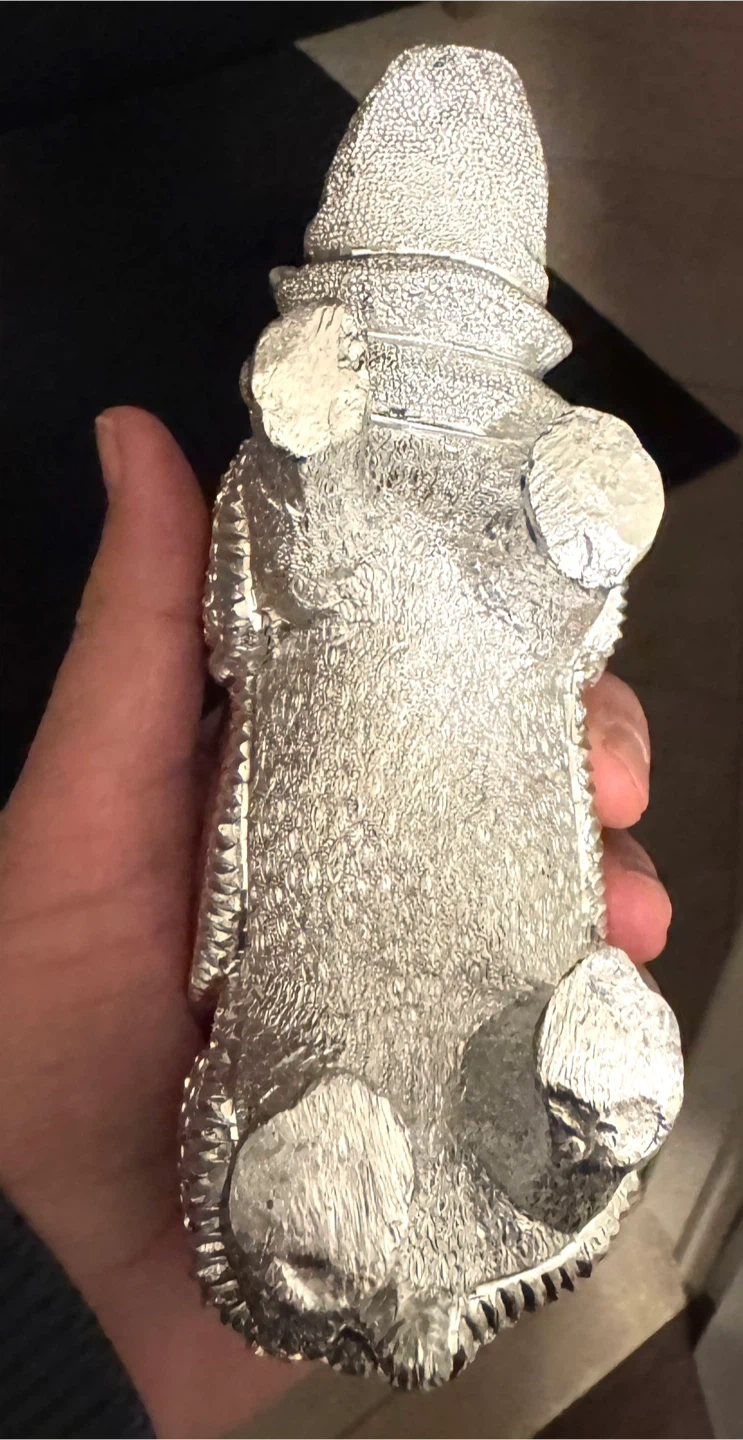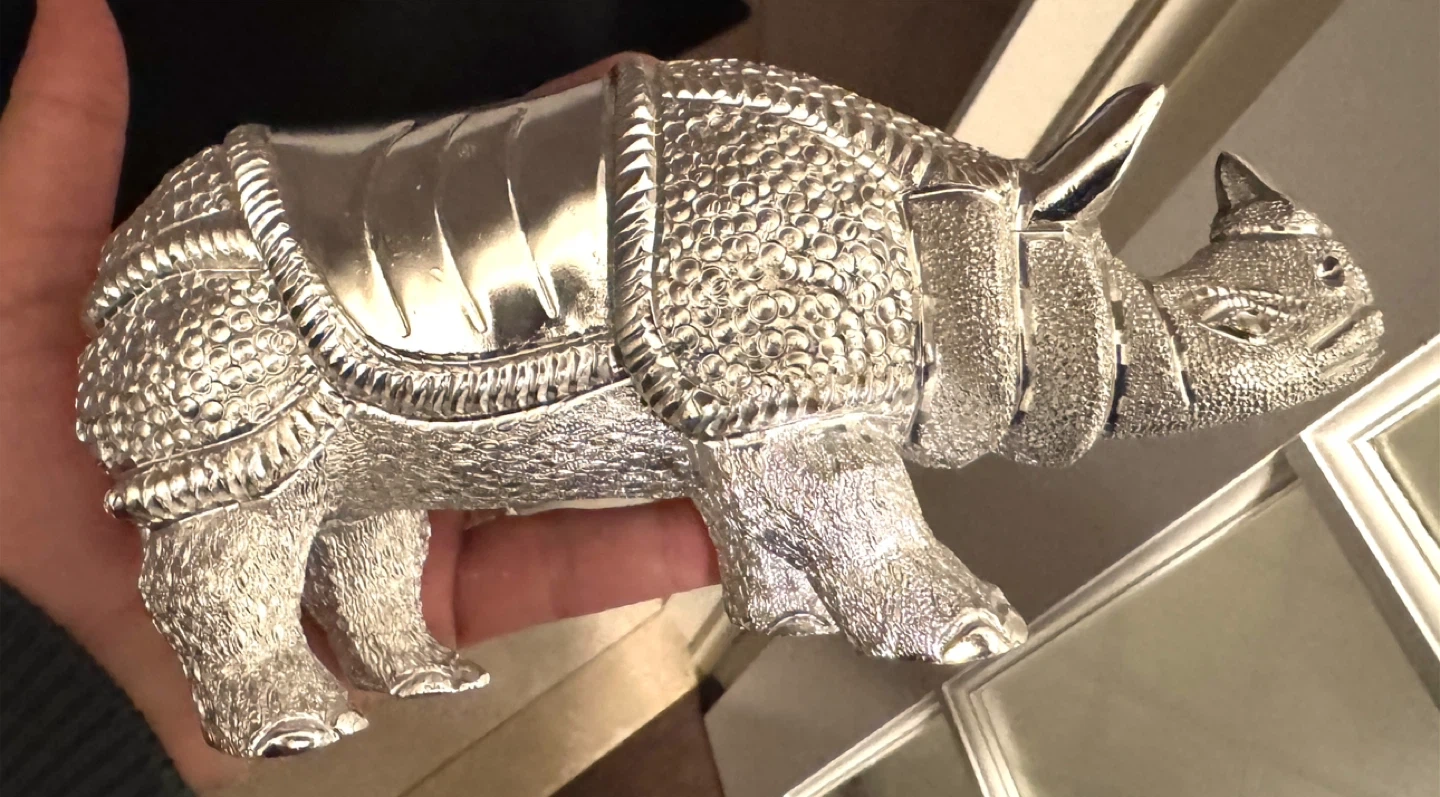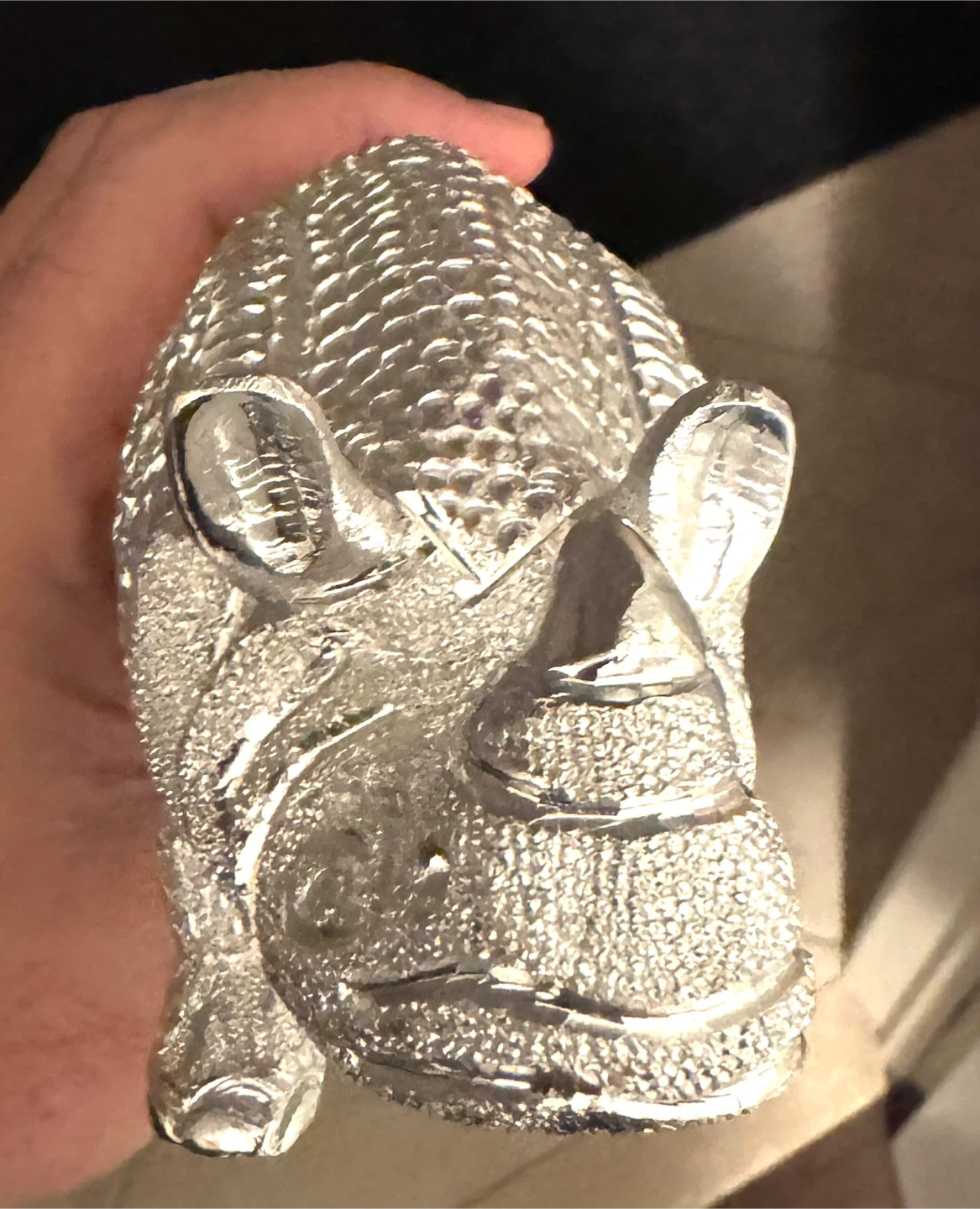 This is a decorative silver-tone rhinoceros figurine. It has a textured finish with intricate detailing across its body and armour plating. Great for adding a touch of unique style to your decor!