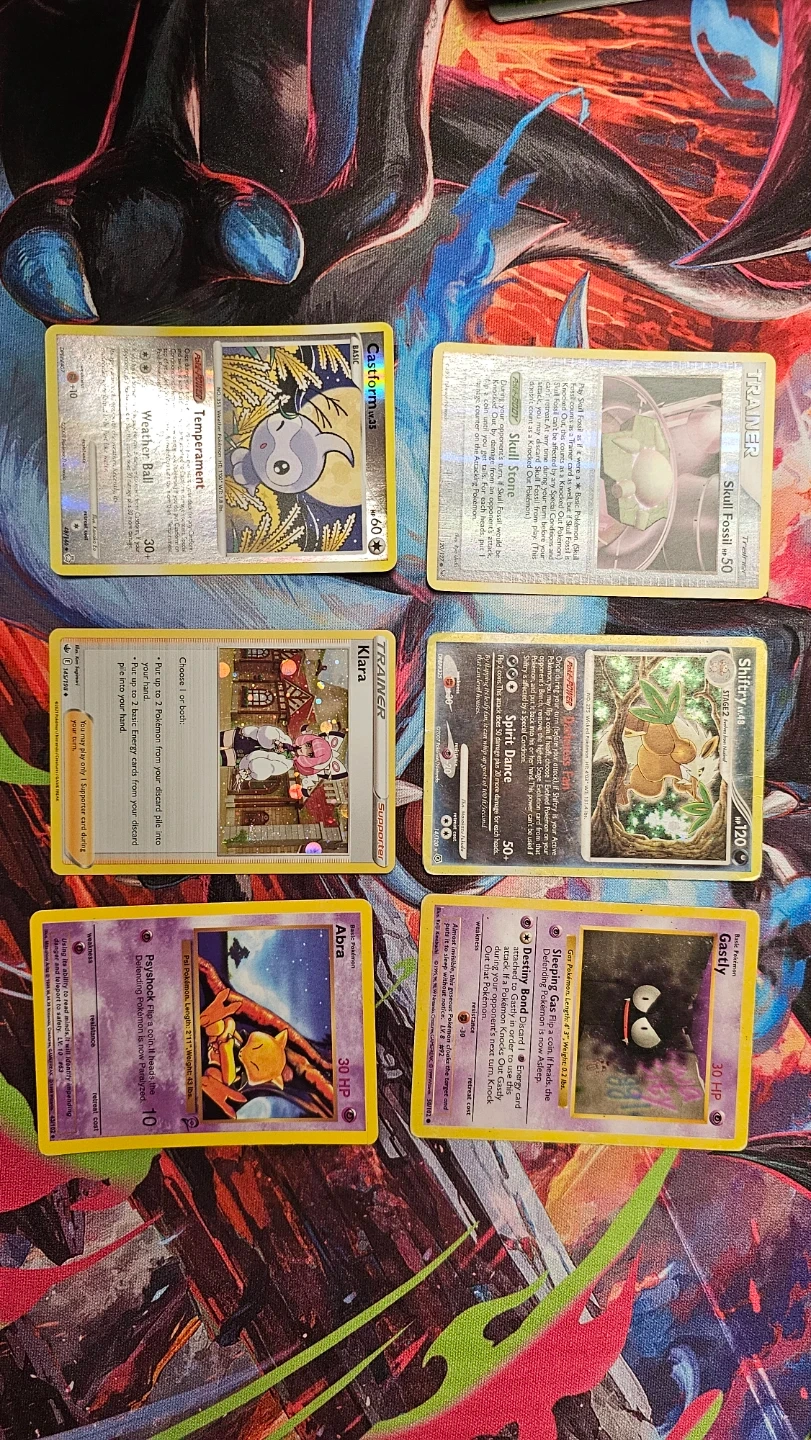 Collection of 6 Pokémon trading cards including Castform, Skull Fossil, Klara, Shiftry, Abra, and Gastly. Cards have various HP and abilities like Temperament, Skull Stone, Spirit Dance, Psyshock, and Sleeping Gas. These are great for any Pokémon TCG collector!