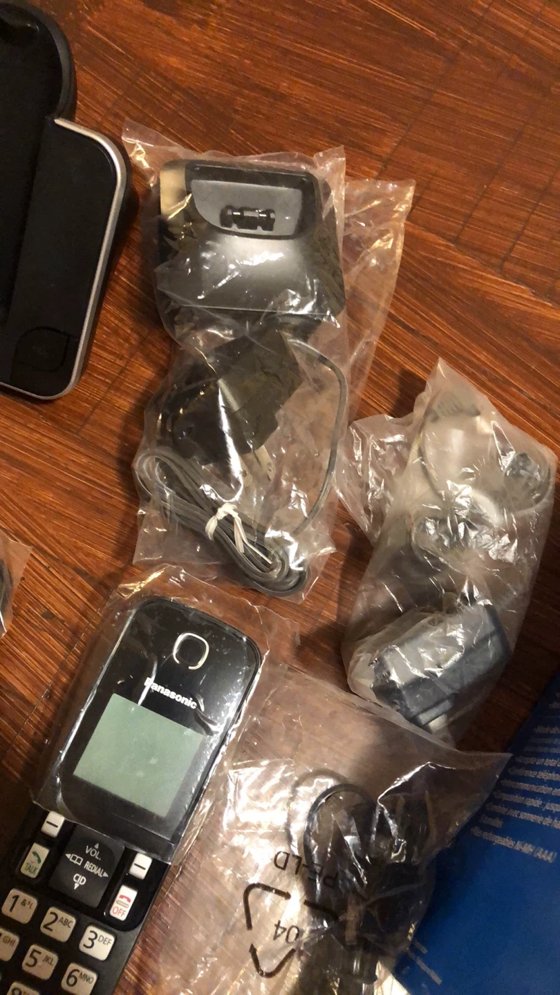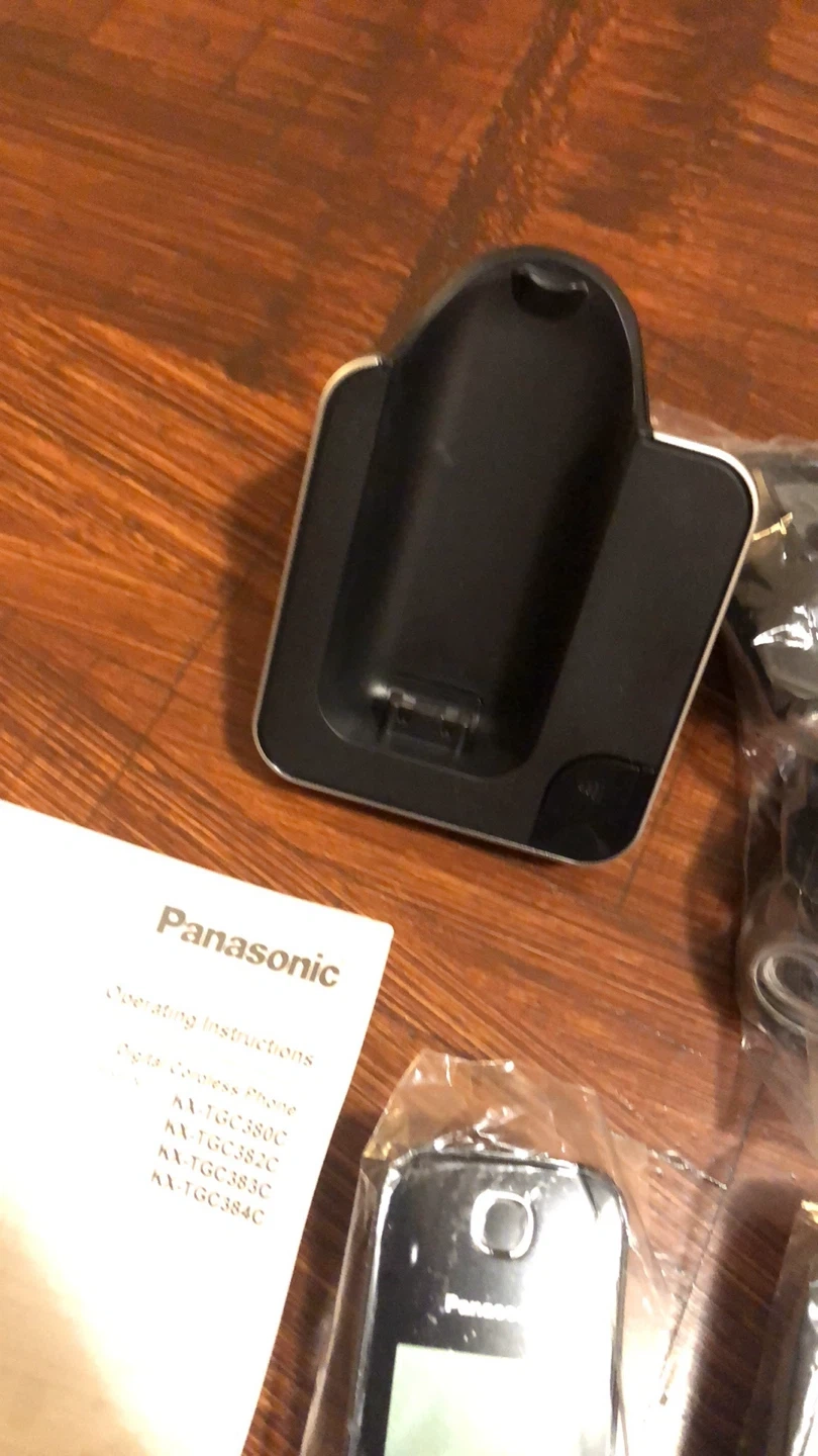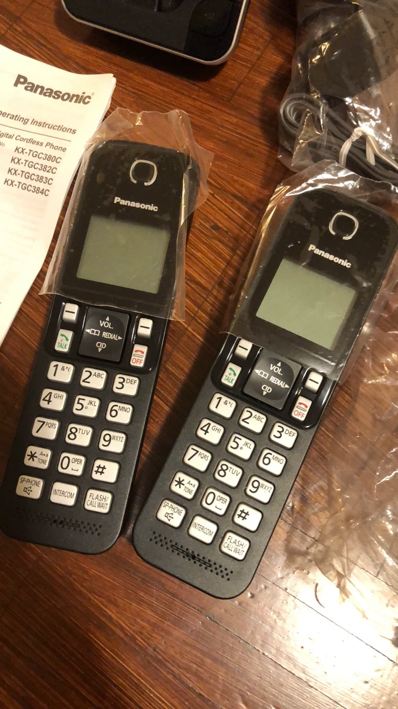 This is a Panasonic KX-TGC382C digital cordless phone system. It includes two handsets and a base unit with charging cradle. This system offers shock resistance and a backlit display and keypad.