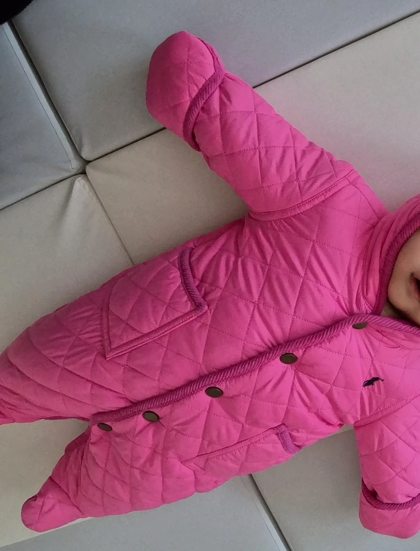 Bright pink quilted snowsuit from Ralph Lauren. Features a full snap-front closure and hood. Perfect for keeping your little one warm and cozy during cooler months!