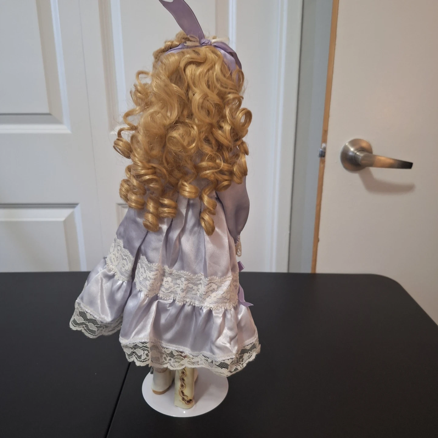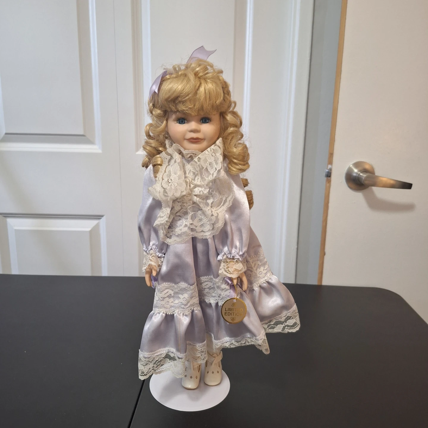 This is a limited edition porcelain doll with blonde curly hair and blue eyes. It's wearing a lovely lavender dress with lace trim. The doll stands on a white display base.