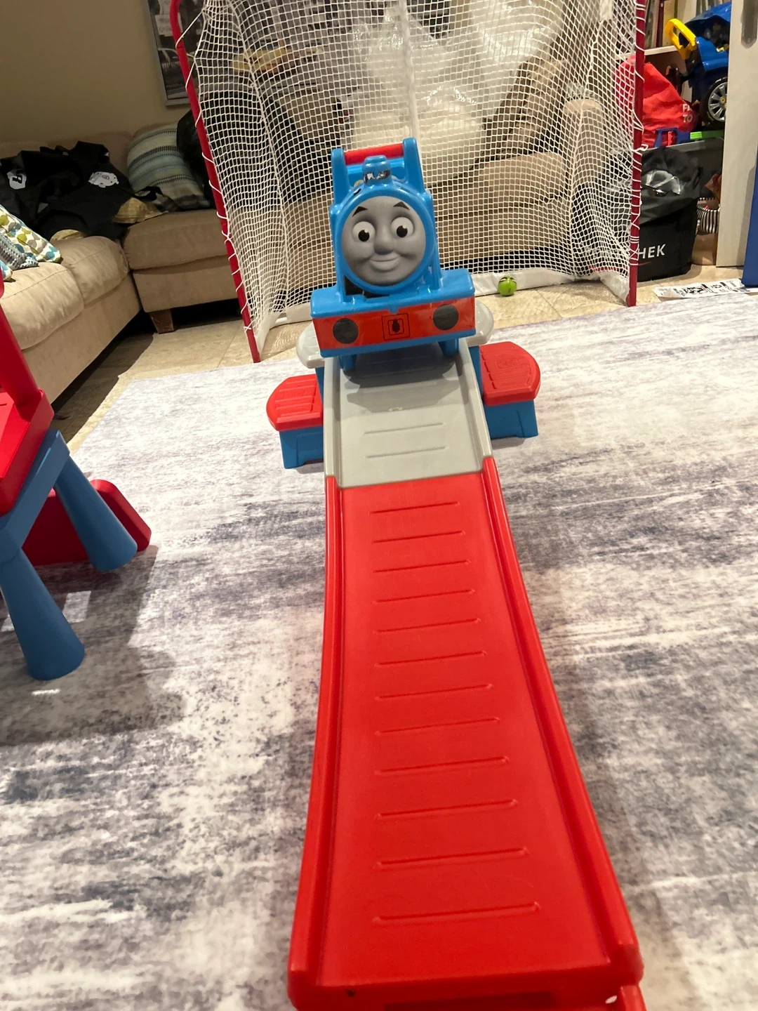 It's a fun ride-on toy featuring Thomas the Tank Engine! Kids can slide down the red track after riding Thomas. Made of durable plastic.