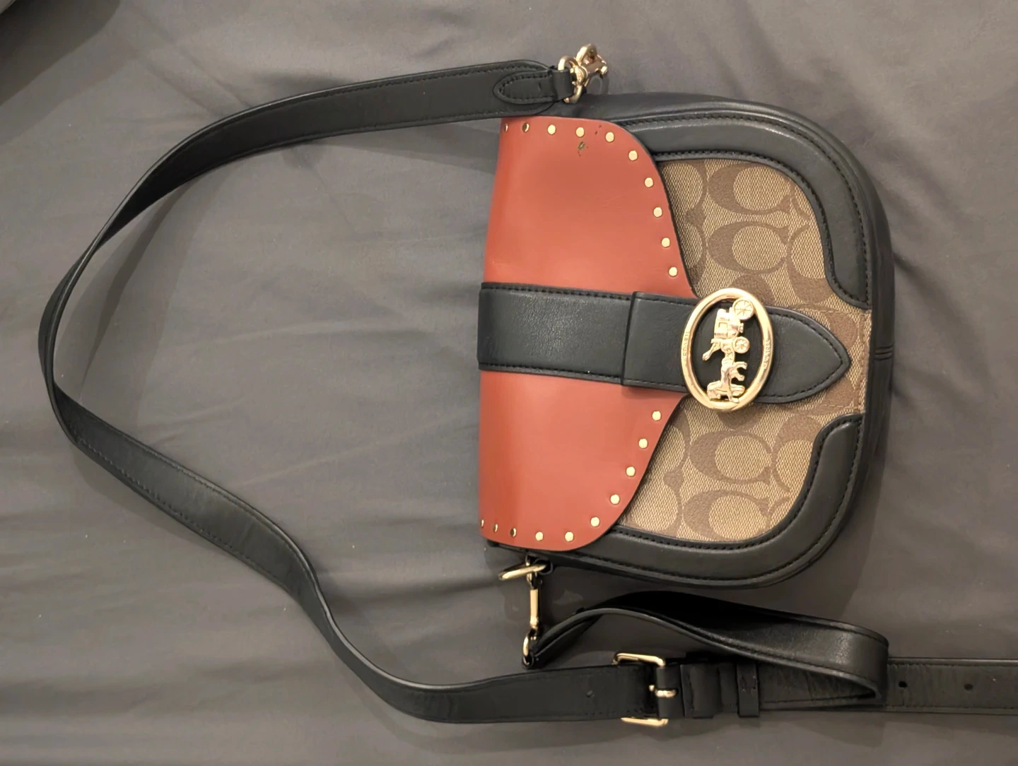 A classic Coach saddle bag featuring the signature "C" print and a special Disney Mickey Mouse buckle. It's made with leather trim and has a secure closure. Perfect for carrying your essentials in style!