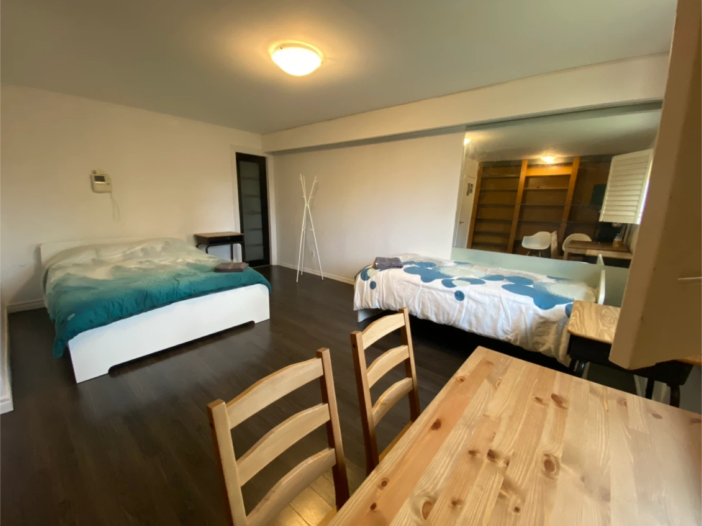 This listing is a master bedroom featuring two separate beds, 1 queen size bed and 1 twin size . Dining table and an en-suite bathroom.