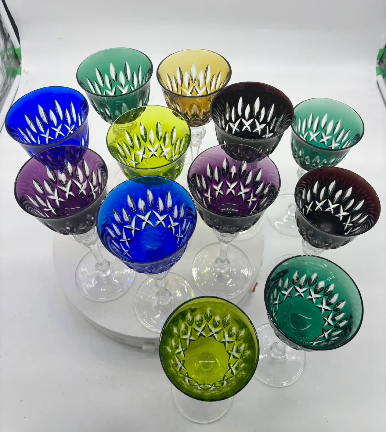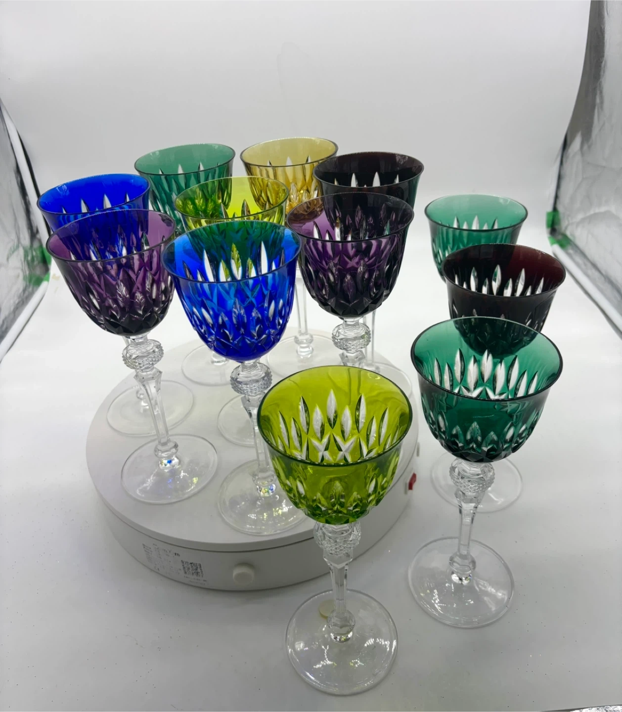 A lovely set of twelve wine glasses in various vibrant colours. Each glass is made of cut to clear crystal. They have a detailed glass stem with a textured band.