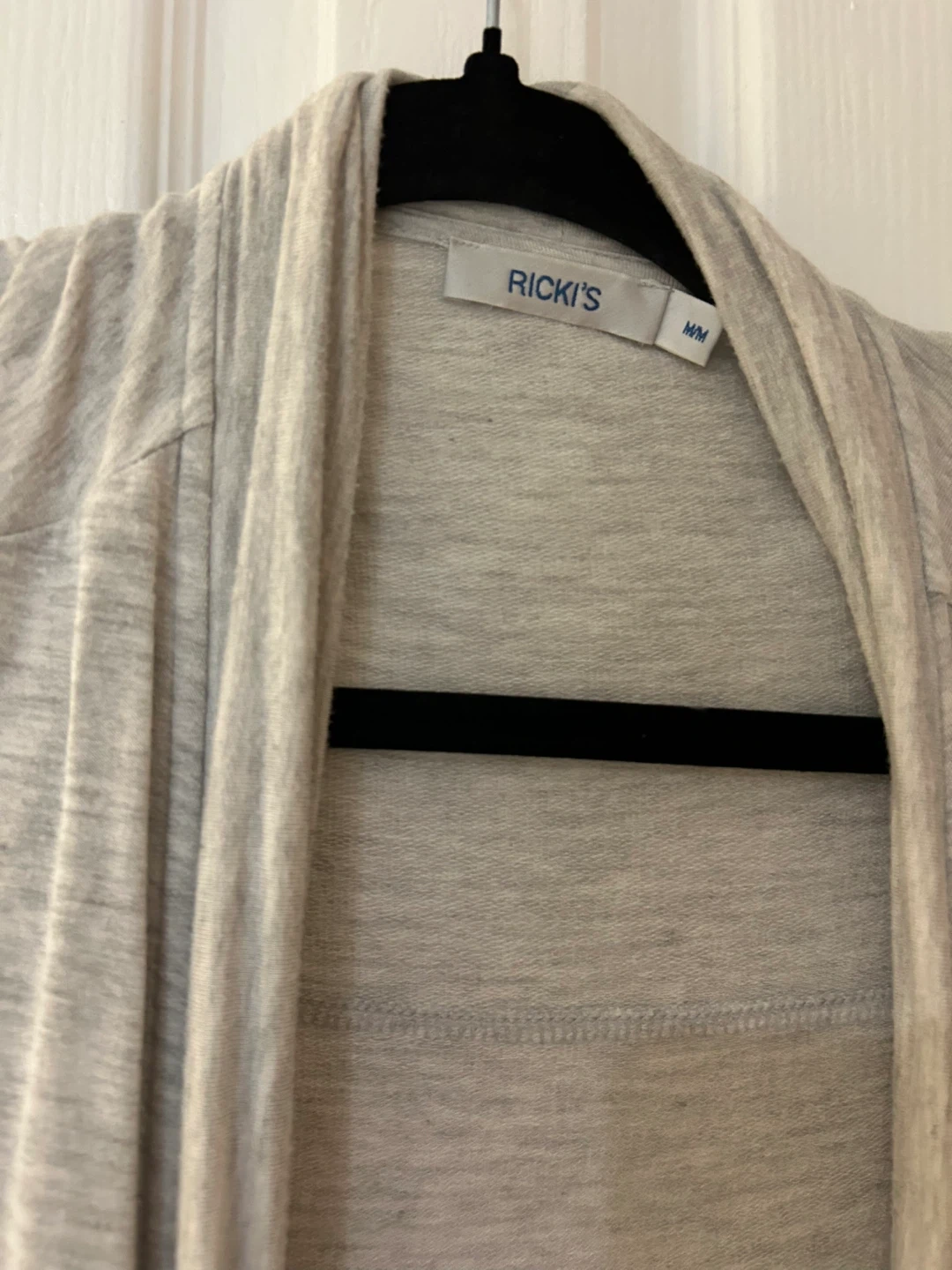 Grey Ricki’s Open Cardigan, has thumb holes.