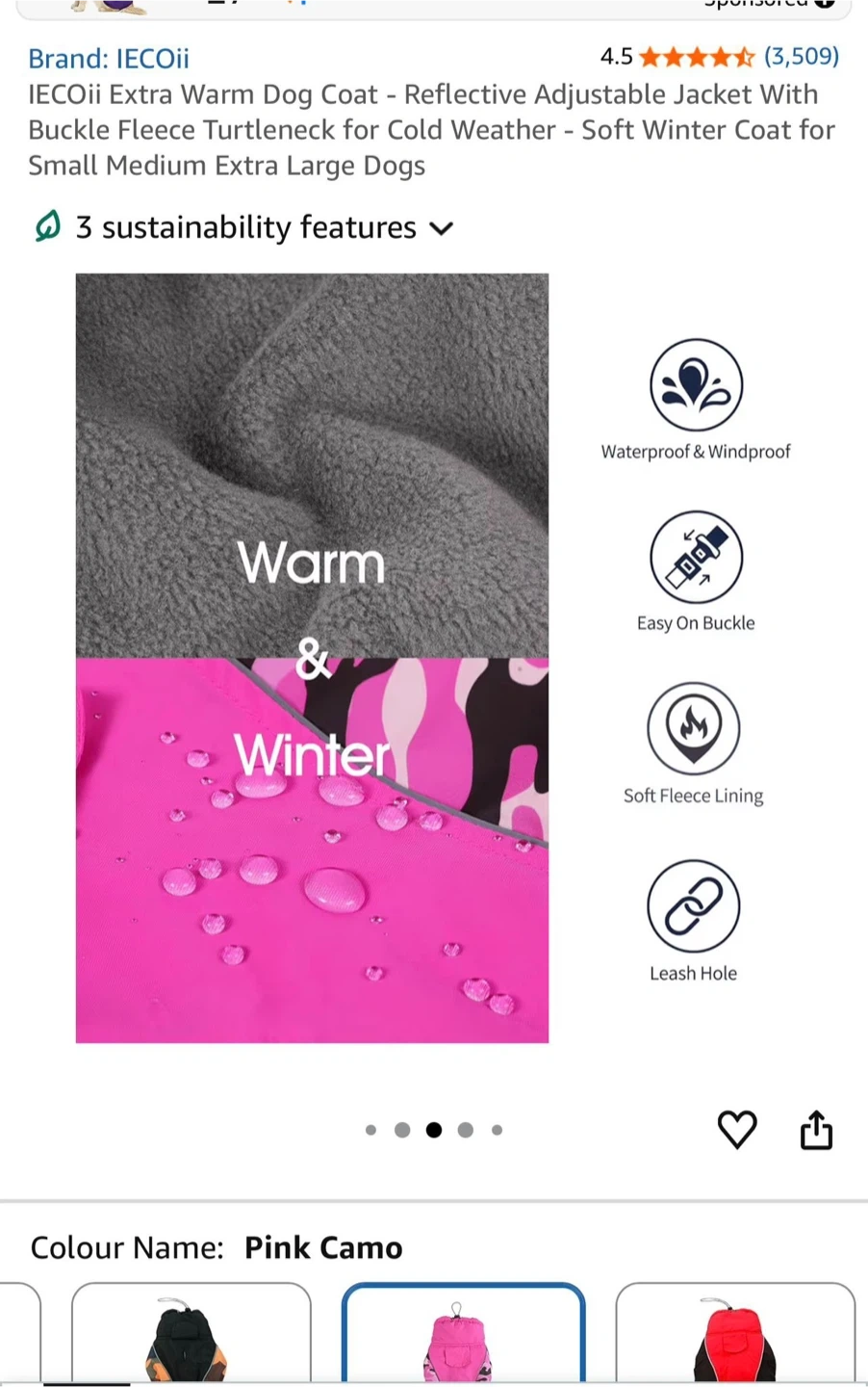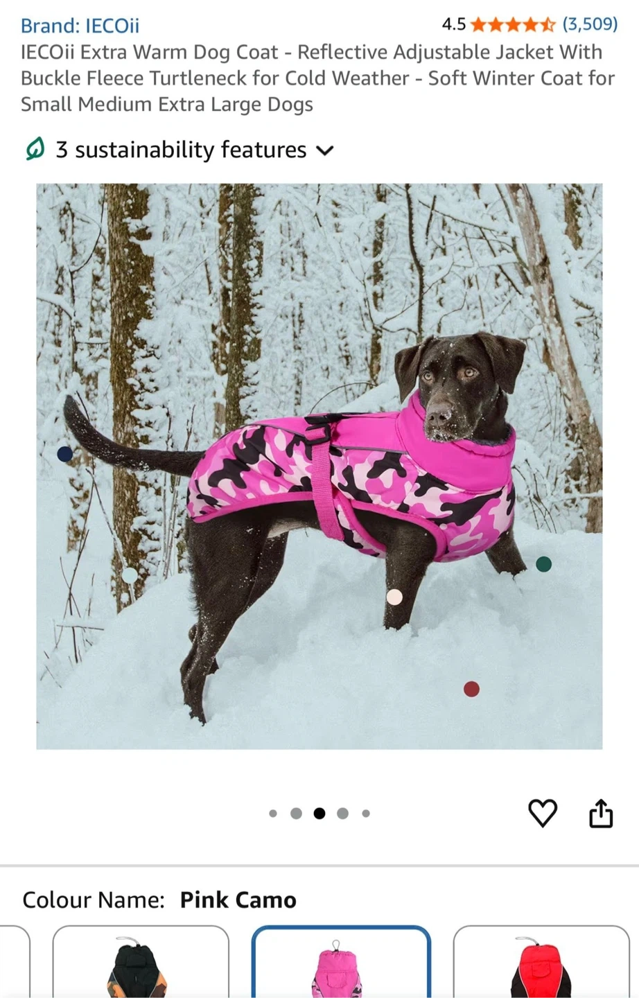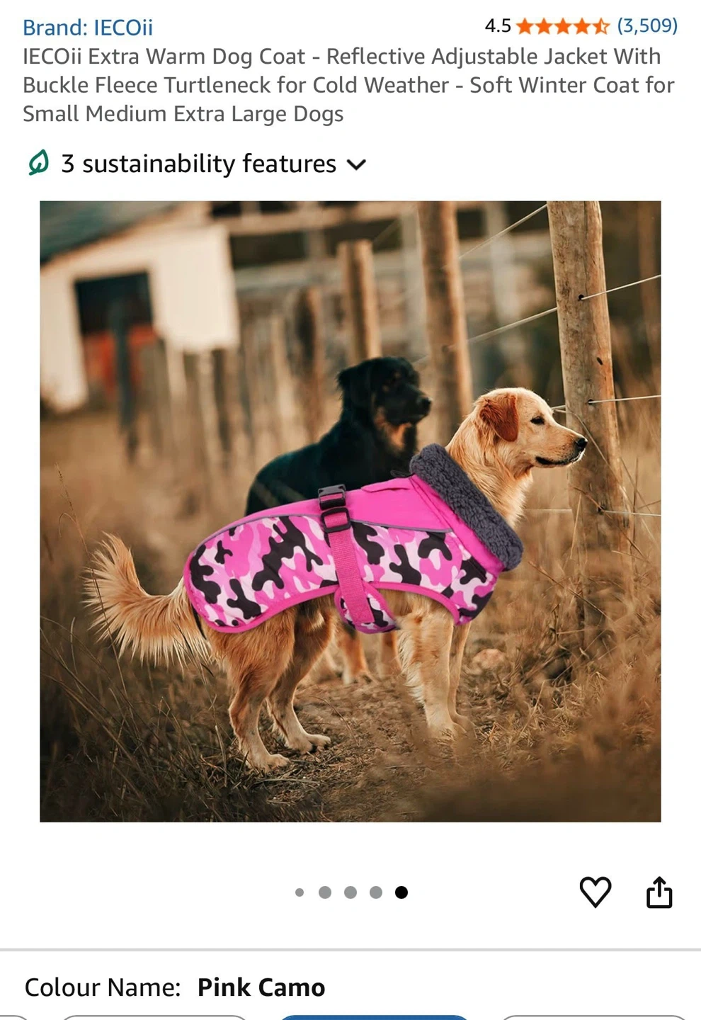 This IECOii dog coat is extra warm for cold weather, featuring a reflective design and buckle fleece turtleneck. It's made with a soft winter lining and comes in a cool pink camo pattern. This coat is suitable for small to extra-large dogs.