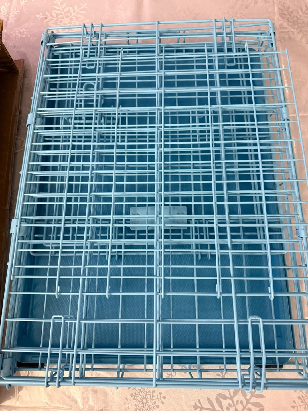 This is a blue Midwest Homes for Pets iCrate, 60.96 cm long. It folds down flat for easy storage and portability. It includes a leak-proof pan and floor protecting feet.