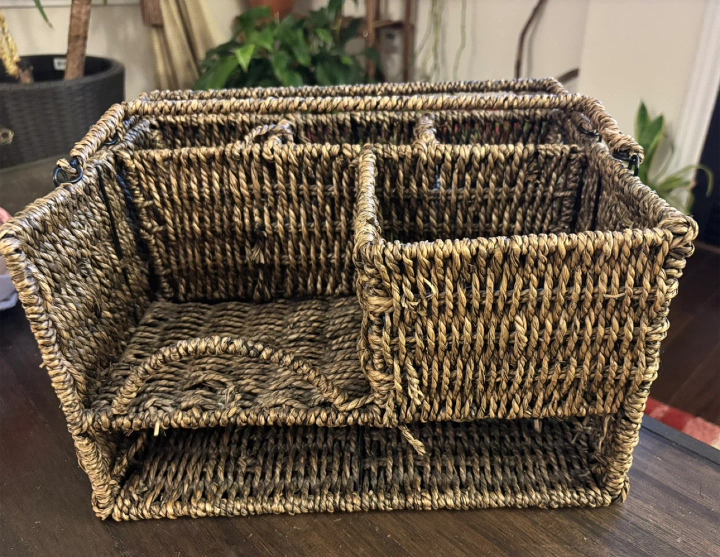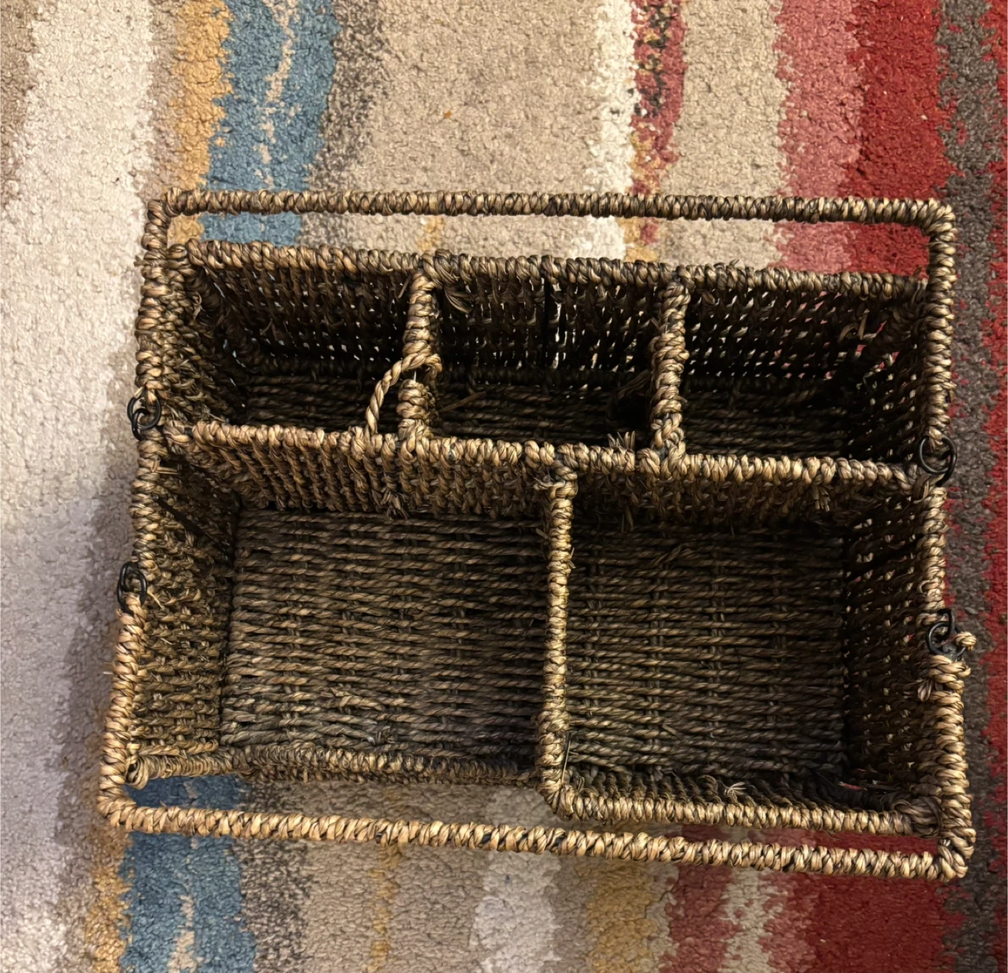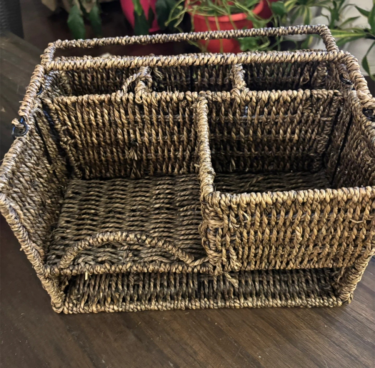 This is a woven organizer caddy with multiple compartments. It's made of natural fibres and has a handle on top. It's perfect for keeping your desk or craft supplies tidy!
