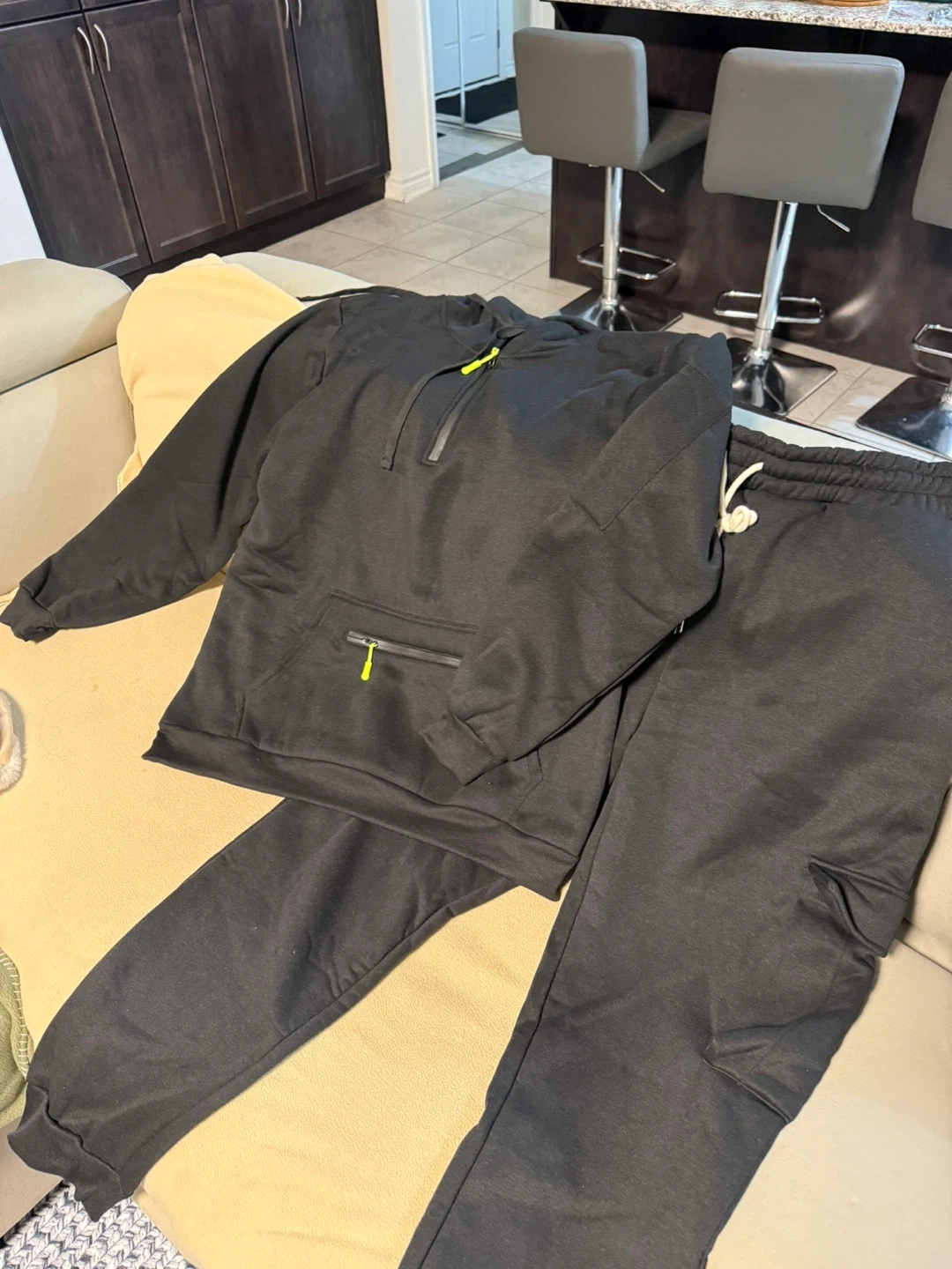 This is a black hoodie and jogger set. The hoodie features a half-zip closure and a kangaroo pocket. The joggers have cargo pockets. This set is made from a comfortable fabric blend.