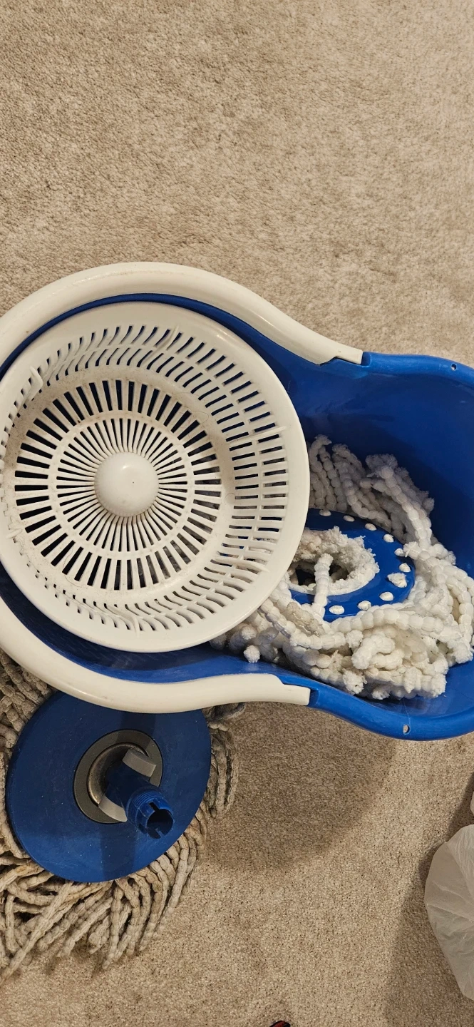 This is a spin mop bucket with a mop head included. It's a blue and white plastic design. This mop is great for cleaning floors!