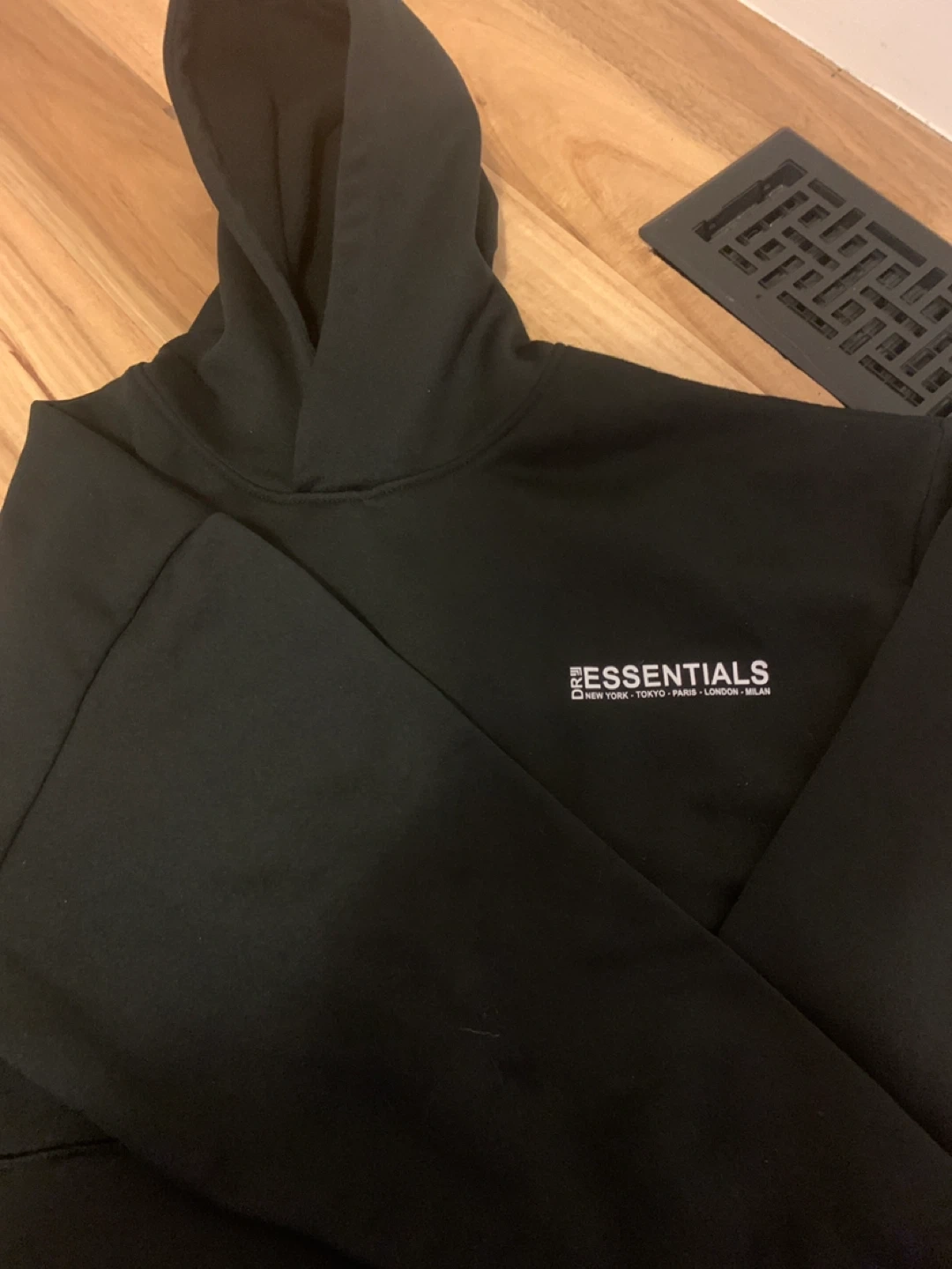 This is a black DRW Essentials hoodie. It's size S/CH and made from a soft material. A great layering piece for cooler weather!