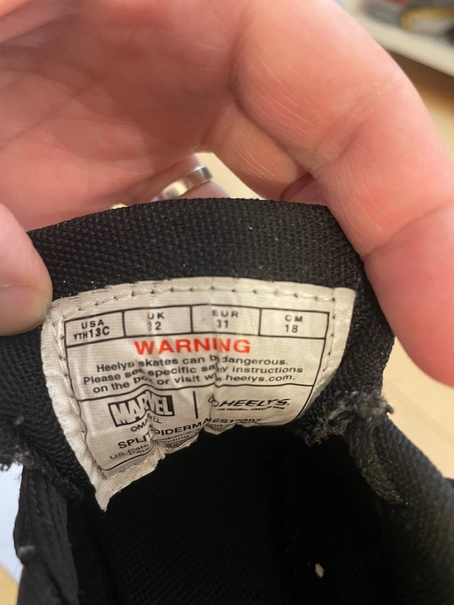 These HEELYS MARVEL MILES MORALES SPLIT SPIDERMAN roller shoes are a child size US YTH 13c, 18 CM. They are in good used condition.