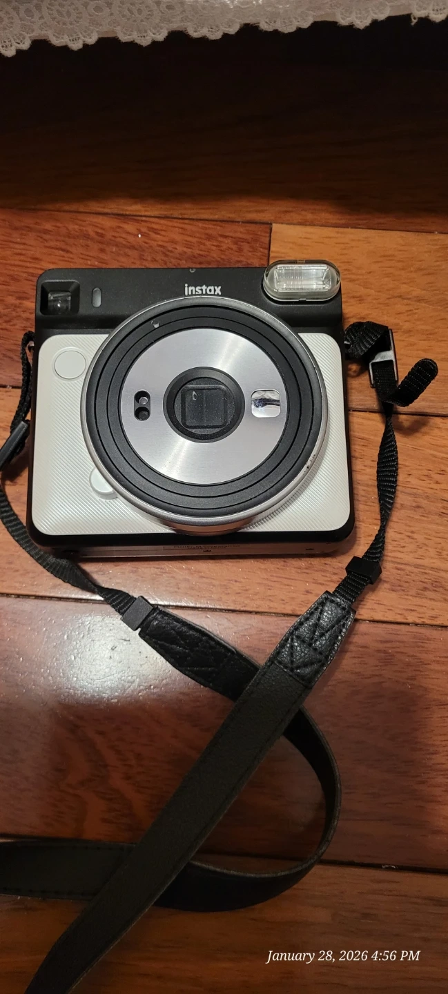This is a Fujifilm Instax Mini 99 instant camera. It's black and silver with a black strap. Perfect for capturing memories instantly!