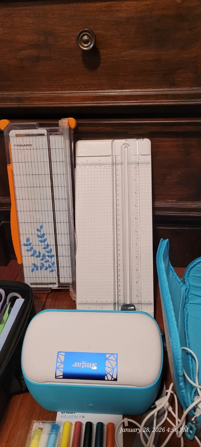 This set includes a Cricut Infusible Ink pen set with 30 pens, a portable Cricut heat press, and two paper cutters, one by Fiskars. It also comes with a black craft tool organizer and a blue storage bag with tools inside. Perfect for all your creative crafting needs!