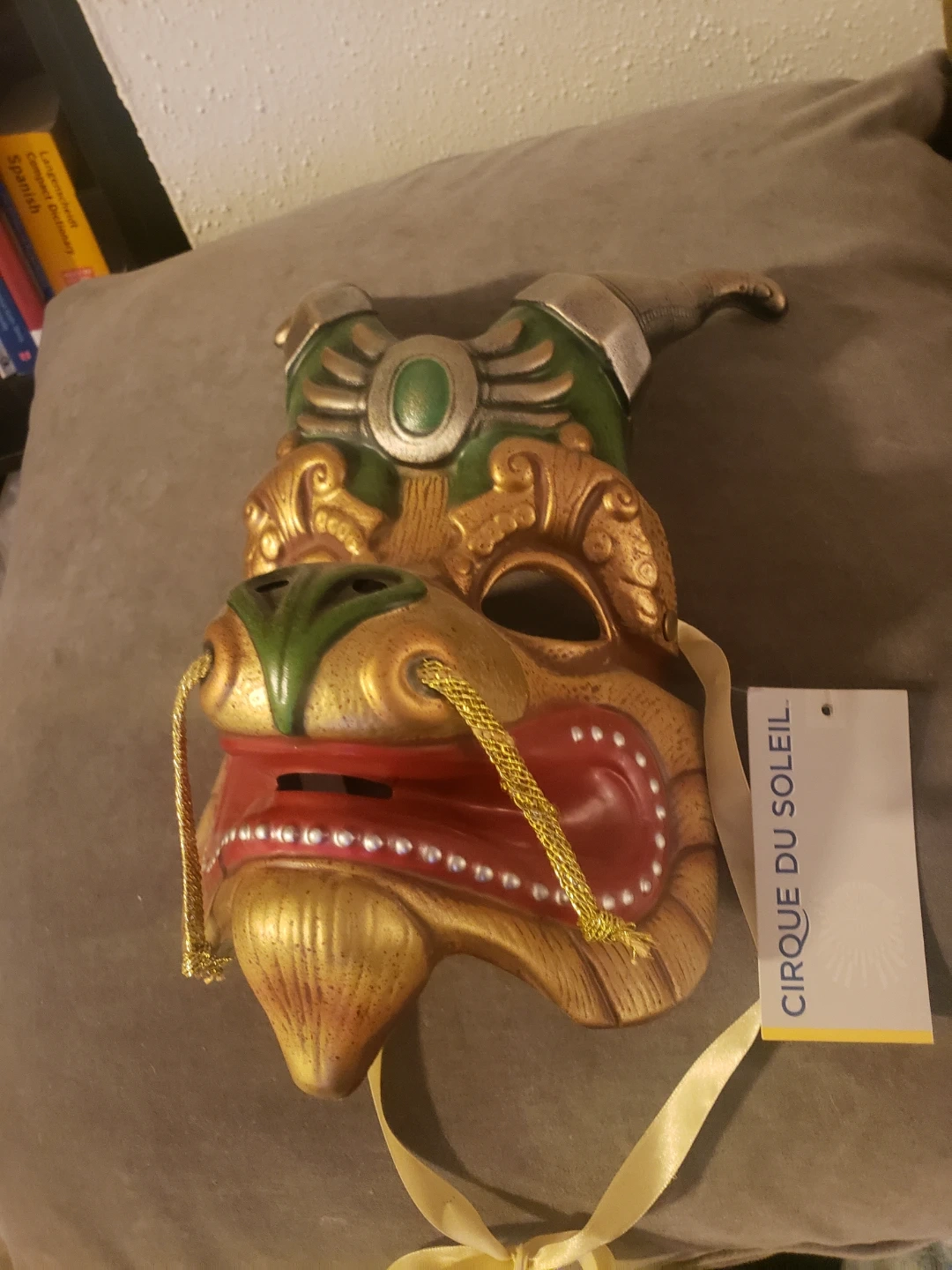 A decorative dragon mask from Cirque du Soleil. It features intricate gold and green detailing with a red mouth and yellow cords for hanging. This mask is a unique collectible.