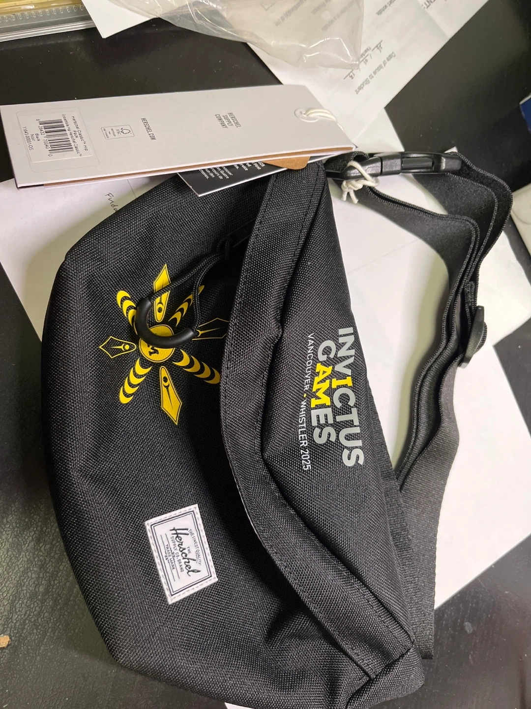This Herschel fanny pack is black and features the Invictus Games Vancouver Whistler 2025 logo. It's made of durable material and includes an adjustable strap. This is completely new with tags still on and comes with plastic bag.