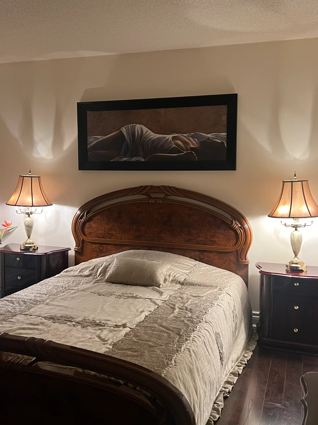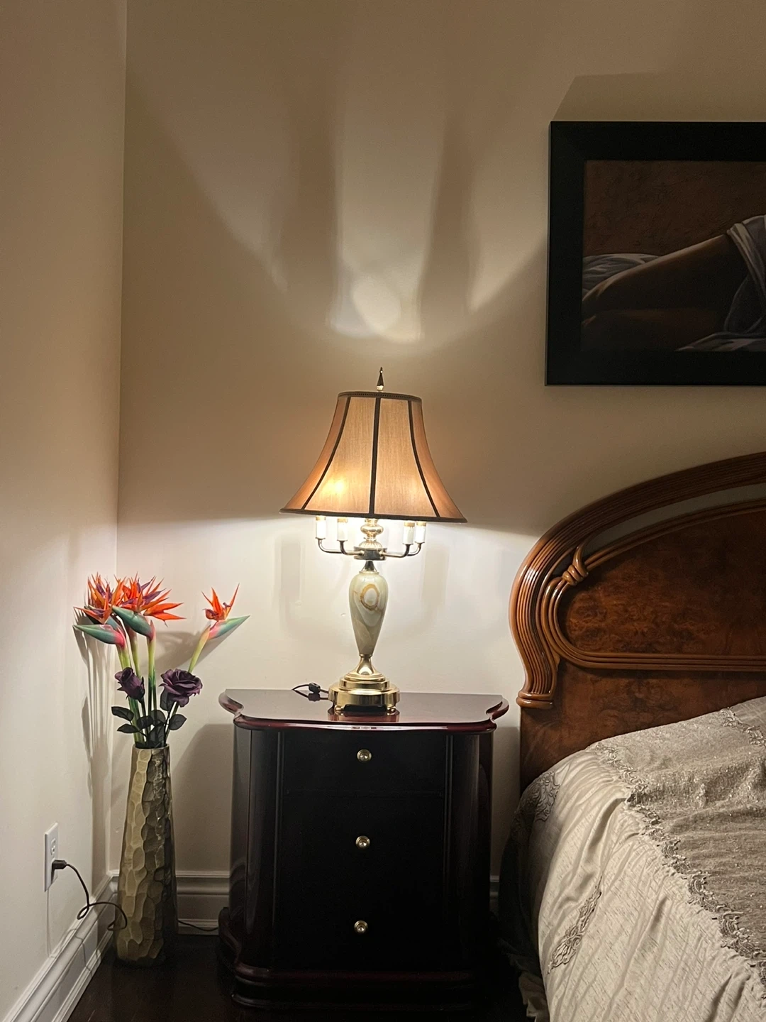 Beautiful table lamp with a unique onyx stone base and brass accents. It provides a warm, ambient light, perfect for a bedroom or living room. The lamp features a classic design and a fabric shade.
