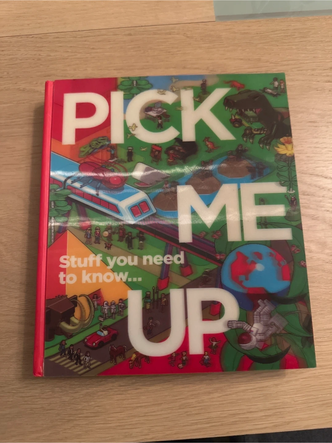 This is the 'Pick Me Up: Stuff You Need to Know!' book by DK. It covers nature, history, science, and more, answering curious questions. It's a fun read for anyone who loves learning new things!