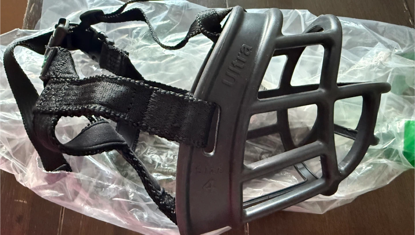 This is a Baskerville Ultra muzzle in black, size 4. It's made from strong, lightweight TPR material. The muzzle is designed for safety and comfort, with an easily adjustable fit. This muzzle is suitable for dogs that need to be prevented from eating things off the ground.