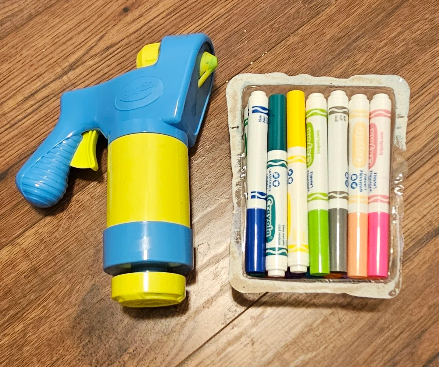 This set includes a Crayola water sprayer and seven washable markers. Marker colours are blue, teal, yellow, green, grey, orange, and pink. They're washable and ready for creative fun!