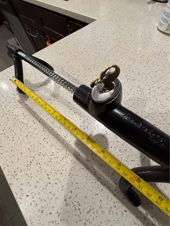 Master Lock Titanium High Security Steering Wheel Lock. Features a quad lock design and is made from titanium material. Convenient push button lock, key required to unlock. 2 keys provided. Cash only.