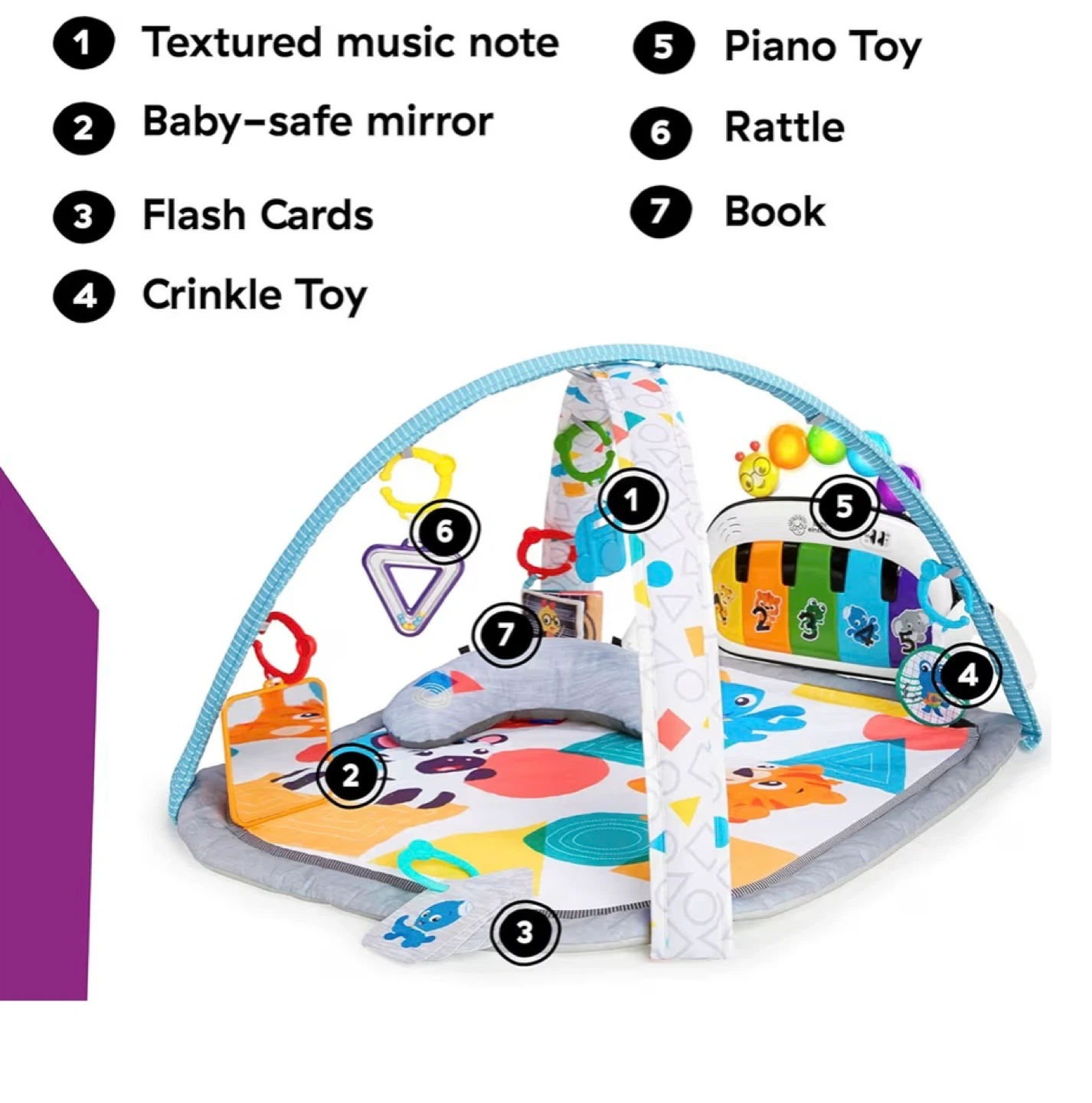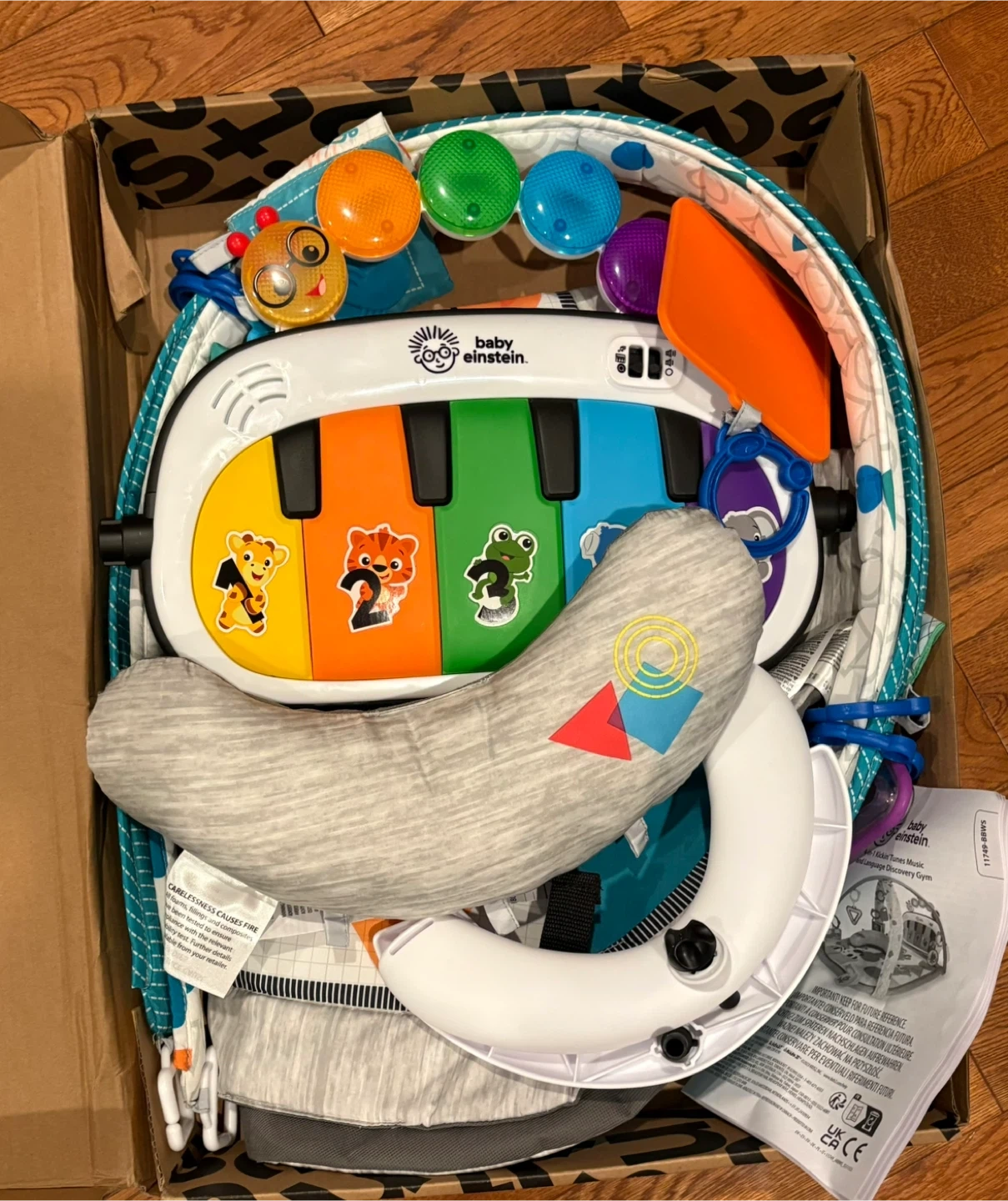 This Baby Einstein play gym features a piano with lights and sounds, plus a prop pillow for tummy time. It's designed for babies aged 0-36 months. Includes multiple toys and a musical mat. New in the box. Cash only, no e-transfers. Pick up only.