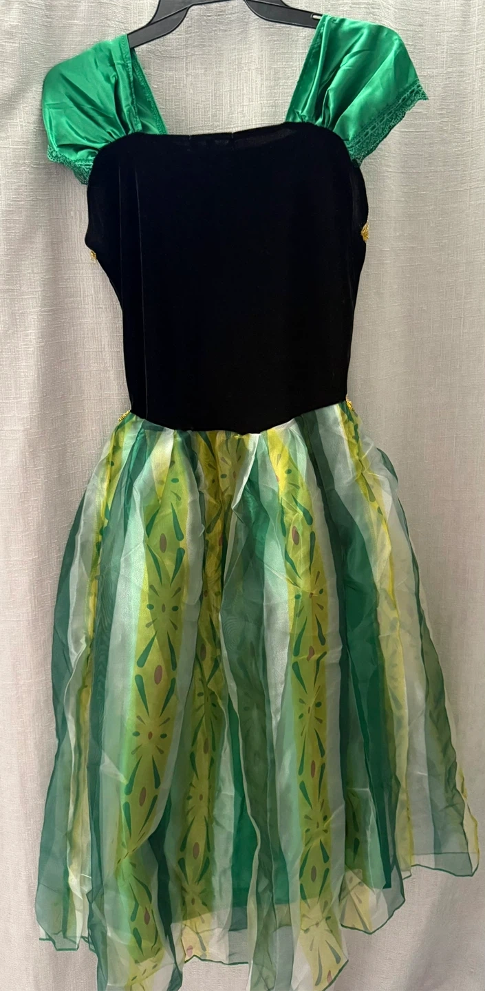 This KUISEN dress is designed as a princess costume. It features a black velvet bodice with embroidered details and a layered skirt in green and yellow. Includes tags.