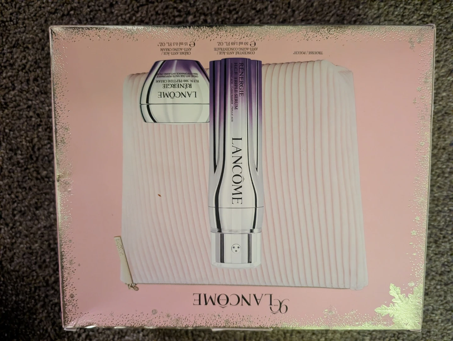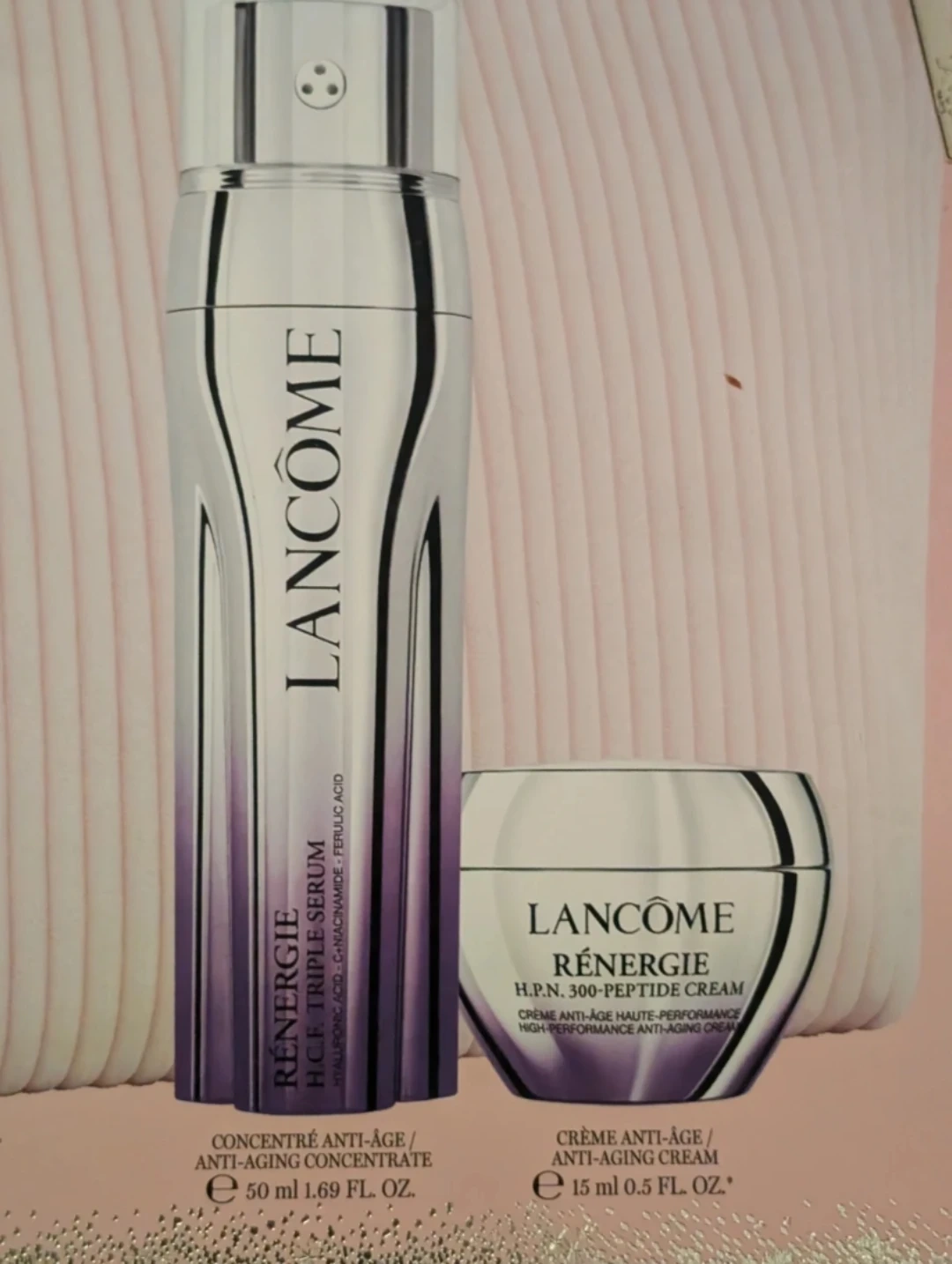 This Lancôme Renergie set includes a triple serum and a H.P.N. 300-peptide cream. The serum is 50 ml (1.69 fl. oz.) and the cream is 15 ml (0.5 fl. oz.). It comes in a pink gift box with a cosmetic pouch.