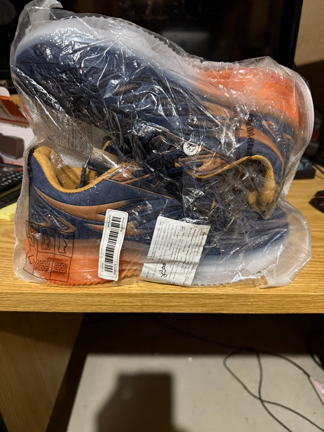 These athletic shoes come in a navy and orange colourway. They feature a breathable textile upper and a durable rubber sole. Size is visible as 43 on the tag.