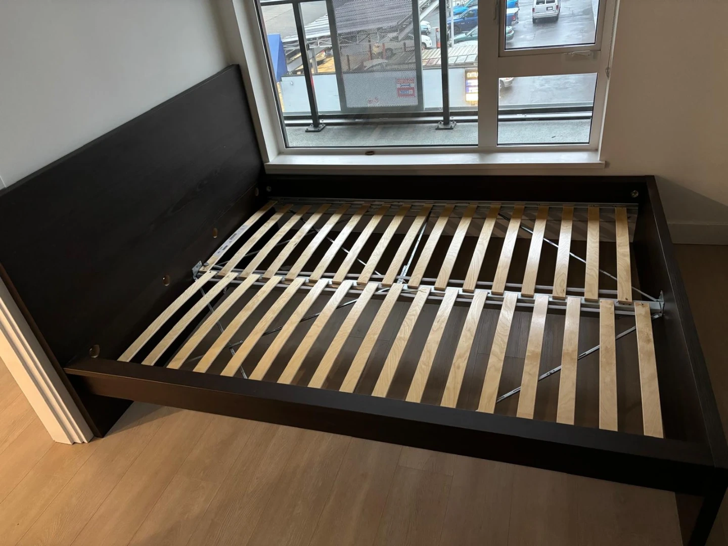 Dark brown queen bed frame with a wooden slatted base. It's made of wood and has a simple, modern design. This frame is ready for a mattress and box spring.