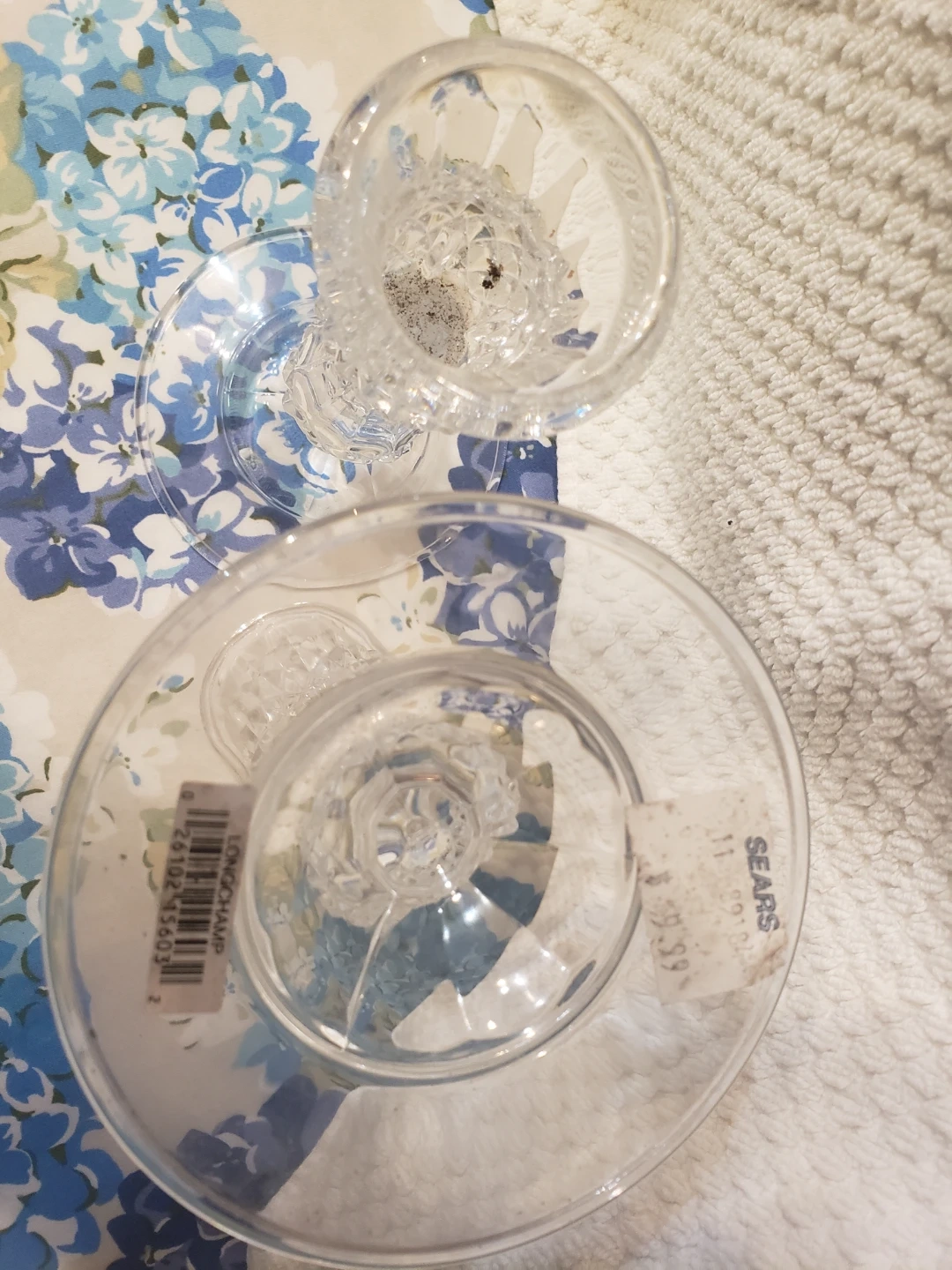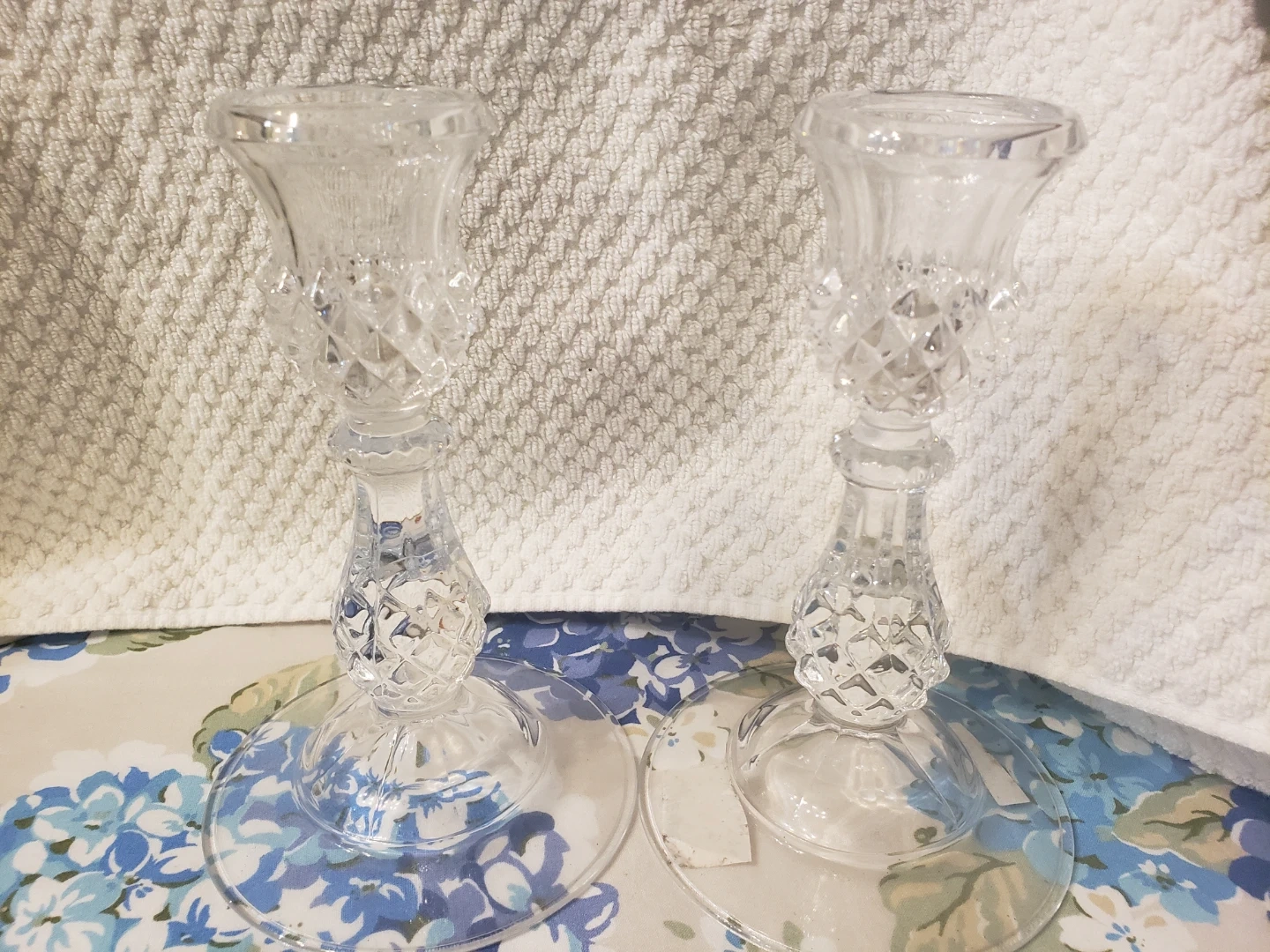 A pair of clear glass candlestick holders with diamond-cut details. They're made of glass and suitable for taper candles. These would look nice on a mantelpiece or dining table!