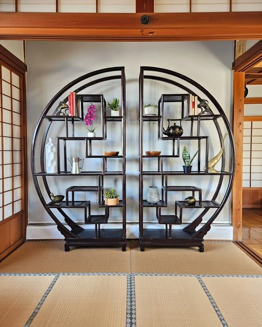 Beautiful two piece solid mahogany yin yang display shelves/room dividers.