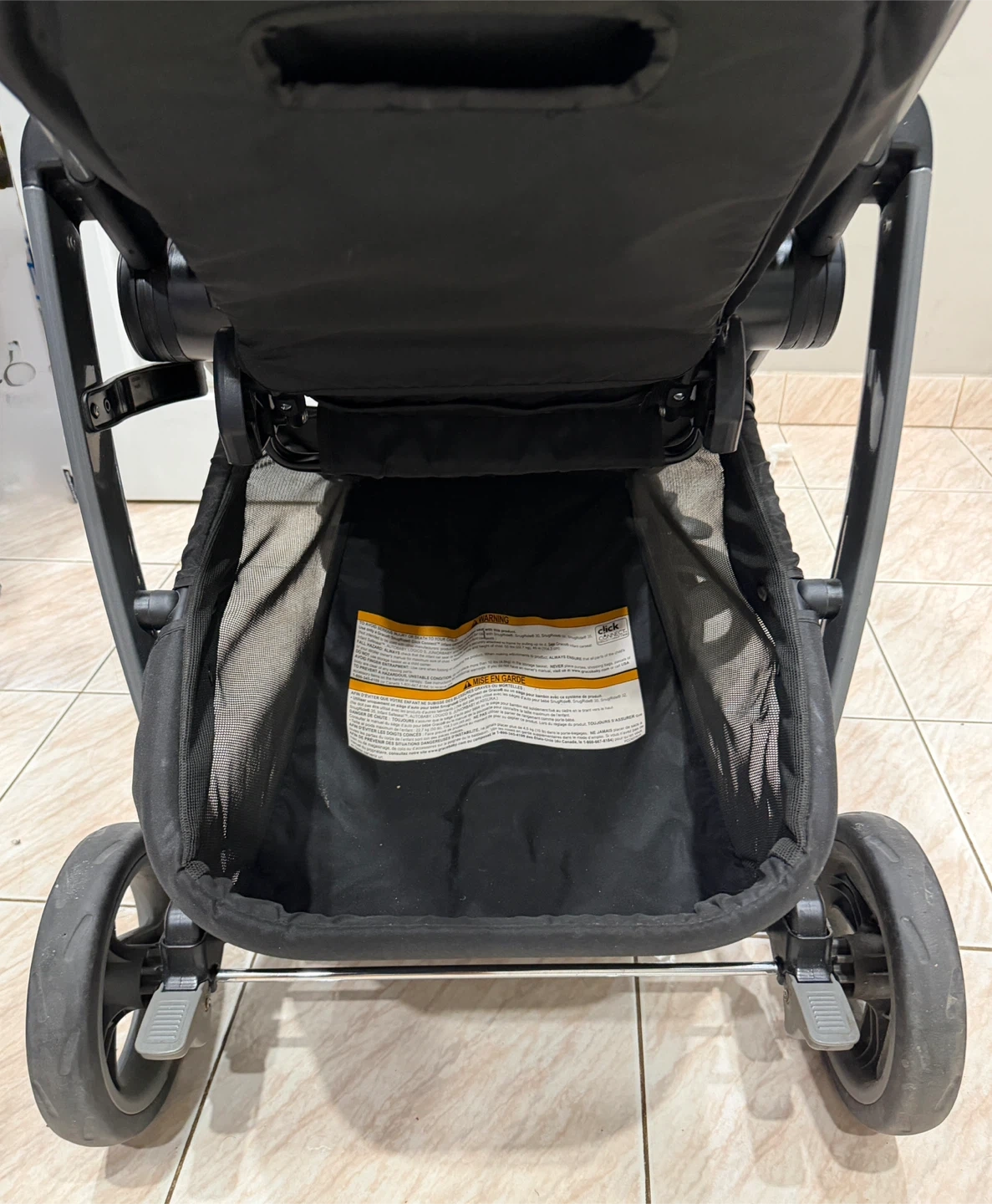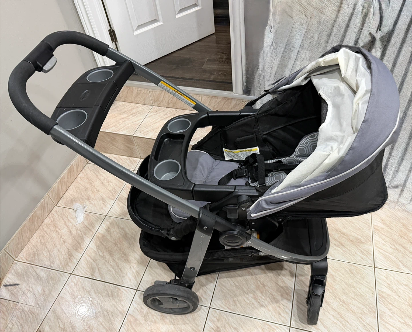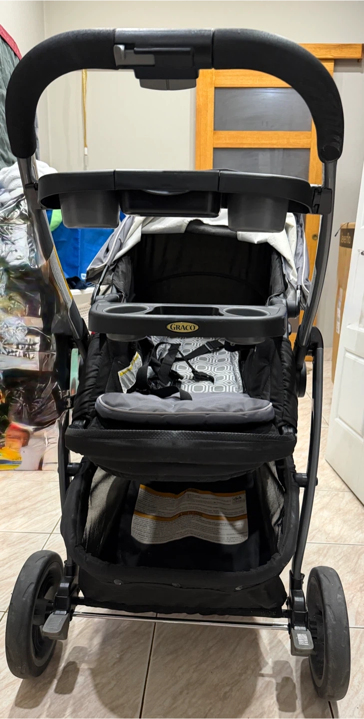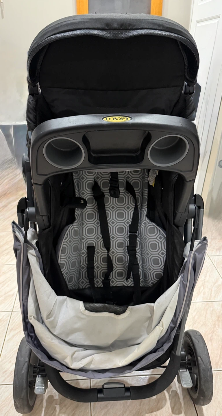 This is a Graco stroller in black and grey. It features multiple cup holders and a large storage basket. It's suitable for babies and toddlers. 3 in 1 Graco Modes click connect stroller